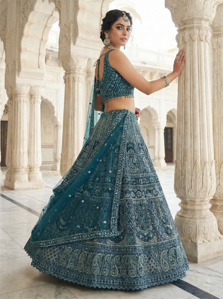 Green Net Heavy Hand Embroidered Ghagra Set