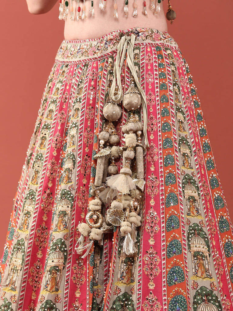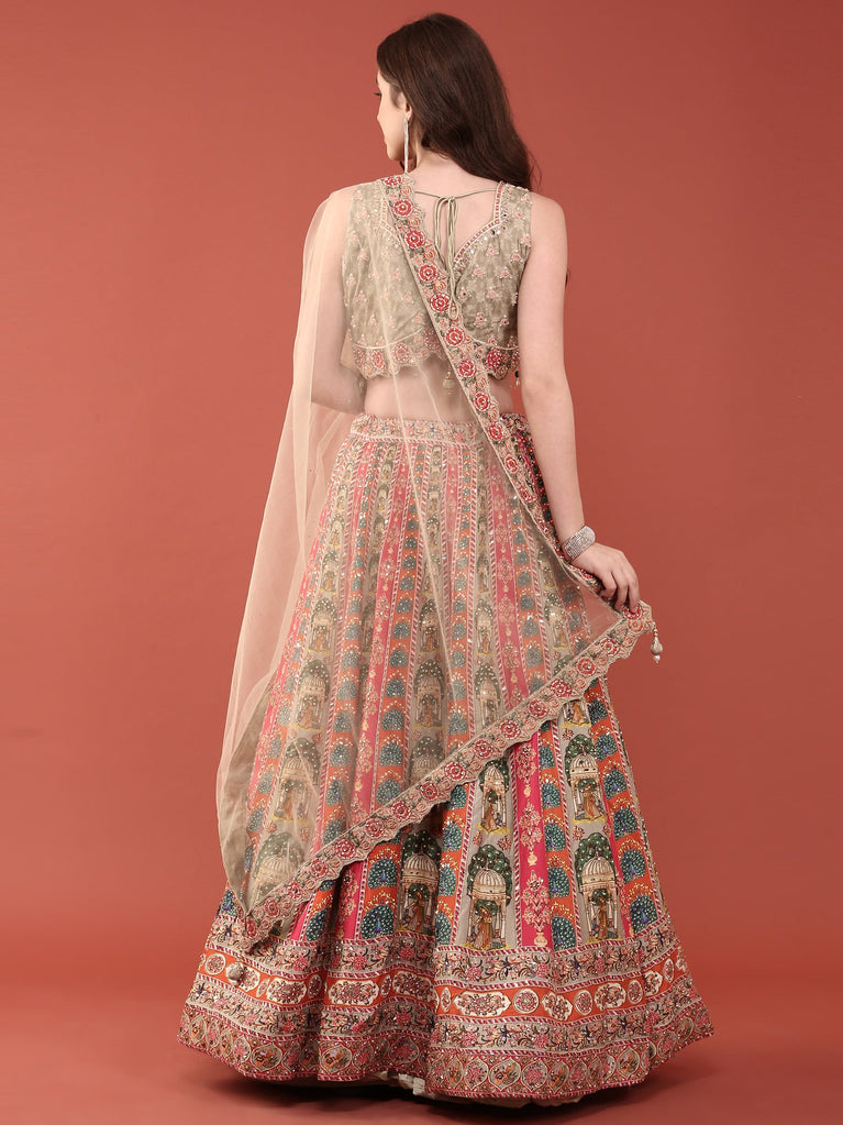 Green Crepe With Digital Print And Thread Work Ghagra Set