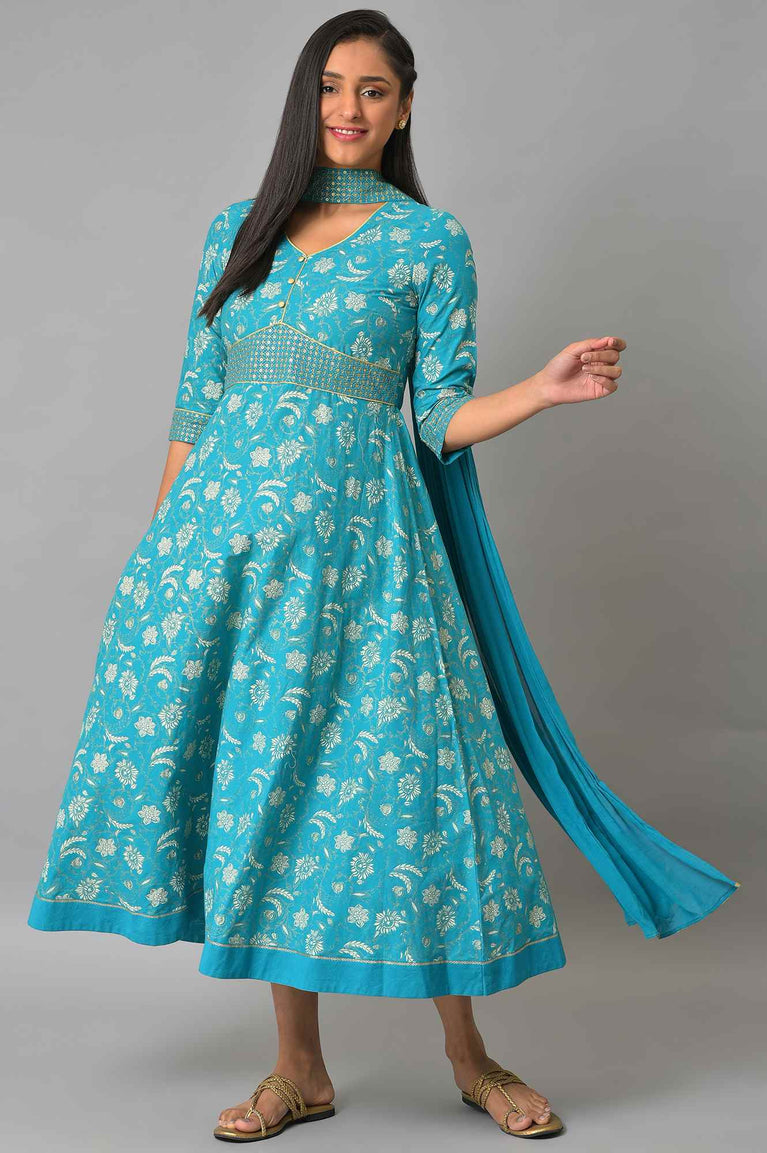 This Three-Piece Kurta Set Includes A Body-Skimming Straight Kurta, A Straight Palazzo And A Complimenting Dobby Dupatta. Crafted In Intricately Woven Yarns, It Features Floral Motifs In Shades Of Blues, White And Yellow.