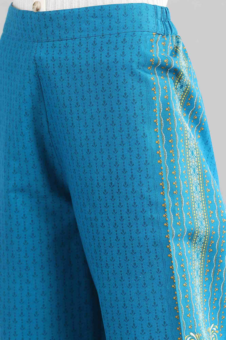 Loose fit ankle length sapphire blue palazzo pants in mid-rise with geometric print.