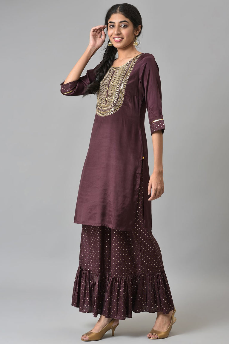 Impactful and striking, two piece LIVA kurta and sharara set includes a short embroiderd kurta and an embroidered narrow palazzo. The embroidery is finely detailed and uses a variety of stitches to give it a contemporary look. Its definately a perfect style that'll make you instantly put together.