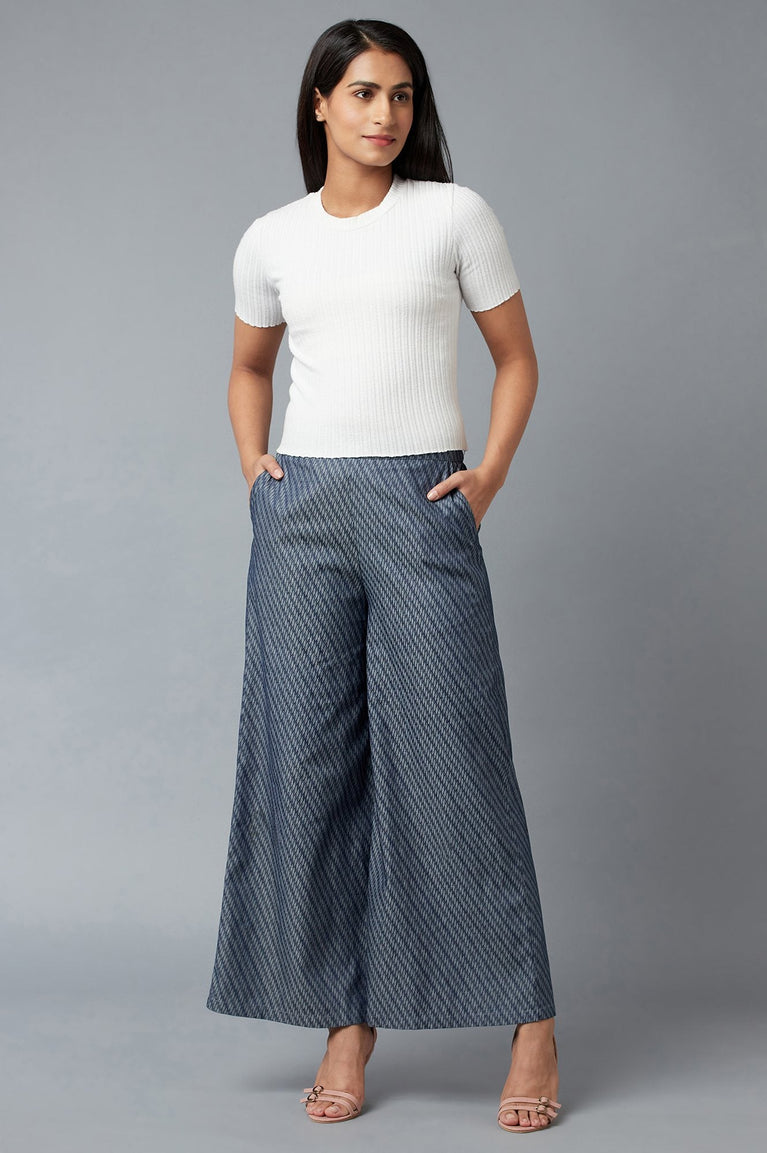 A solid blue palazzo in straight silhouette having mid-rise and partially elasticated waistband. The palazzo also has 2 front pocket and slip-on closure.