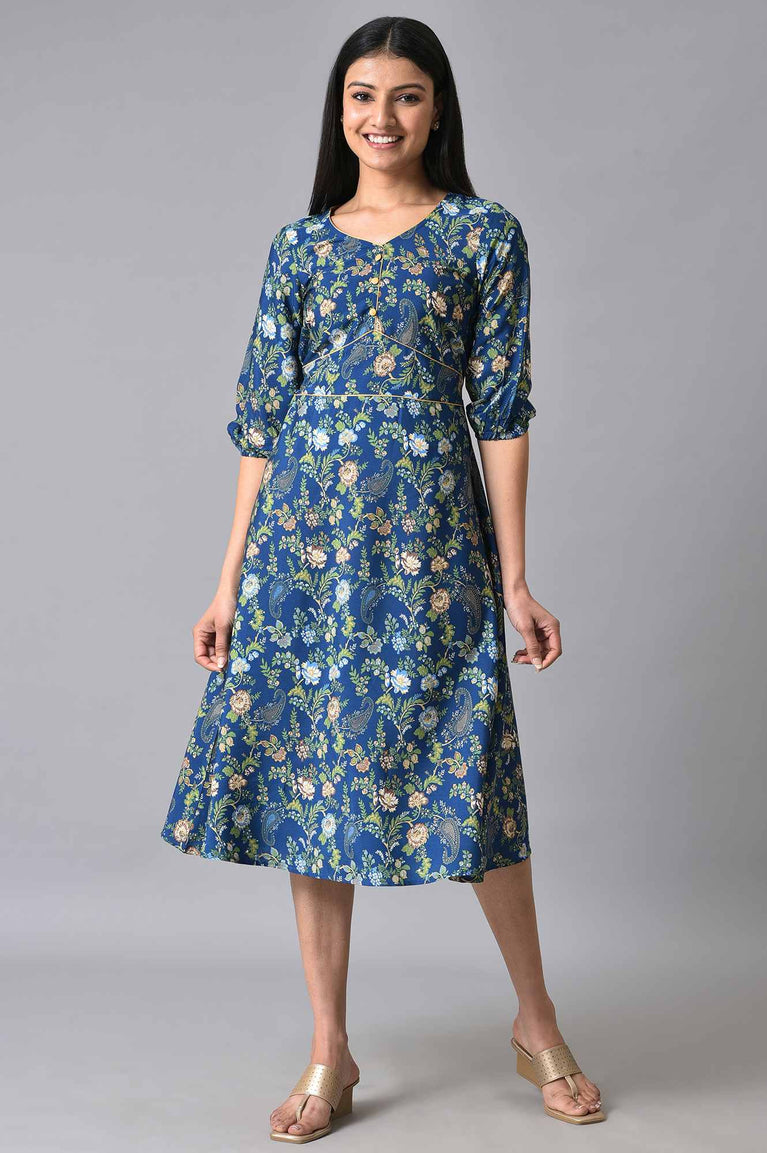 Slay your weekend brunches or dinner date in this beautiful flared floral print dress. The dress has round neck and three-quarter sleeves and comes with a dori and tassel tie-up.