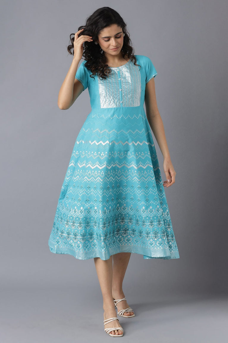 A vibrant expression of festive grace, this stunning kurta for women is a masterpiece of traditional design and modern comfort. Crafted in a breathtaking Azure Sky hue, it’s a piece designed to make you shine at any celebration. It's the kind of apparel you'll feel instantly radiant in. The silhouette is a timeless straight cut that flows effortlessly, offering both elegance and ease of movement right down to its classic straight hemline. This ethnic tunic features a flattering V-neckline, which is highlighted with delicate, shimmering ornamentation that serves as the yoke's focal point, beautifully framing the décolletage. Adding to its charm are the three-quarter sleeves, which provide graceful coverage and end in finely detailed cuffs that echo the intricate design at the neck. Subtle tape detailing runs vertically along the seams, a thoughtful touch that adds a structured yet decorative element to this beautiful garment. The all-over traditional print is inspired by classic motifs, rendered in a crisp pattern that feels both authentic and wonderfully fresh. This printed straight kurta is fully opaque for complete confidence and features comfortable side slits for ease of movement. It's a single, standout piece that forms the perfect foundation for your festive look.