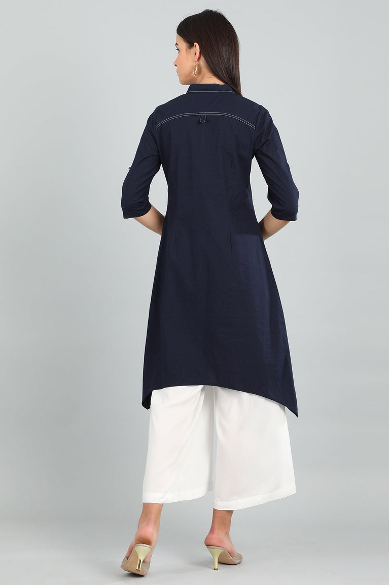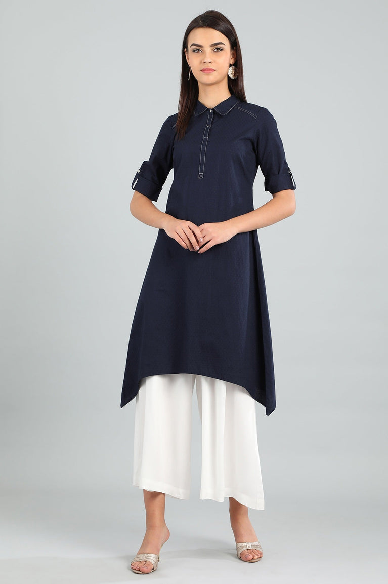 Blue shirt collar yarn-dyed kurta with handkerchief hemline.