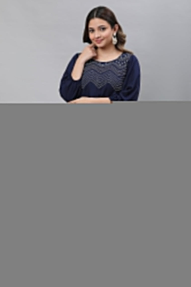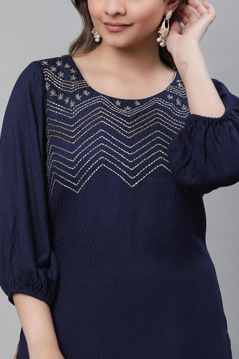 A trendy piece of festive kurta, combined with rich textured rayon complimented with chunky chevron embroidery to make you stand above the crowd. It has a round neckline, with contrast piping, and elasticized piping for a feminine look.