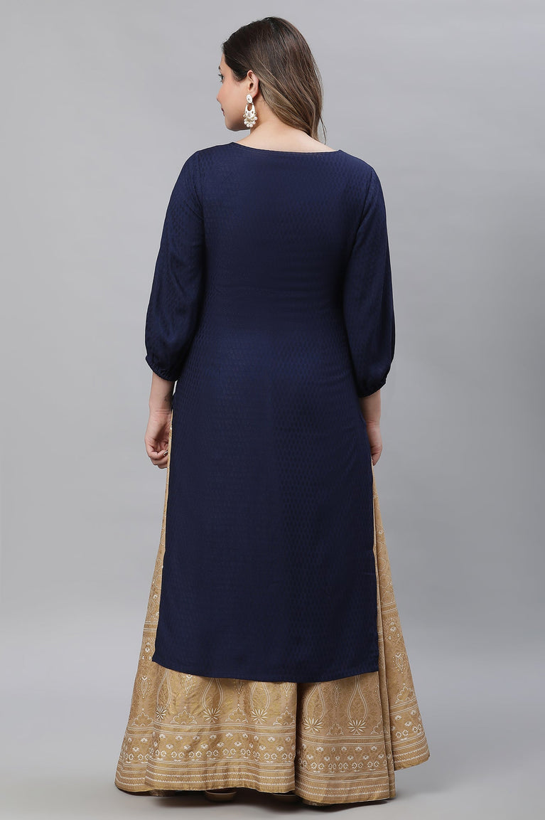 Make a striking addition to your wardrobe with this exquisite jewel blue printed kurta. The basic round neck is enhanced with chunky lace detailing and contrast double pipings for an elegant touch. The kurta's comfortable fit and effortless style makes it a must-have for any fashion-forward wardrobe.