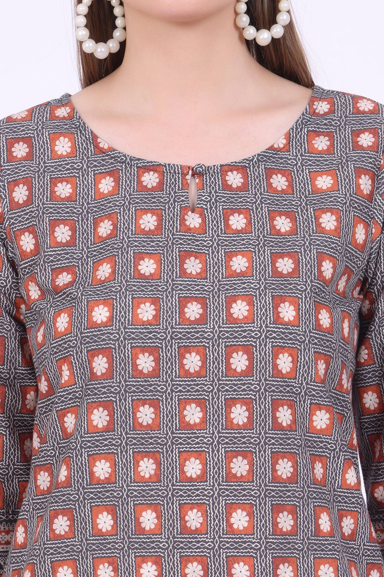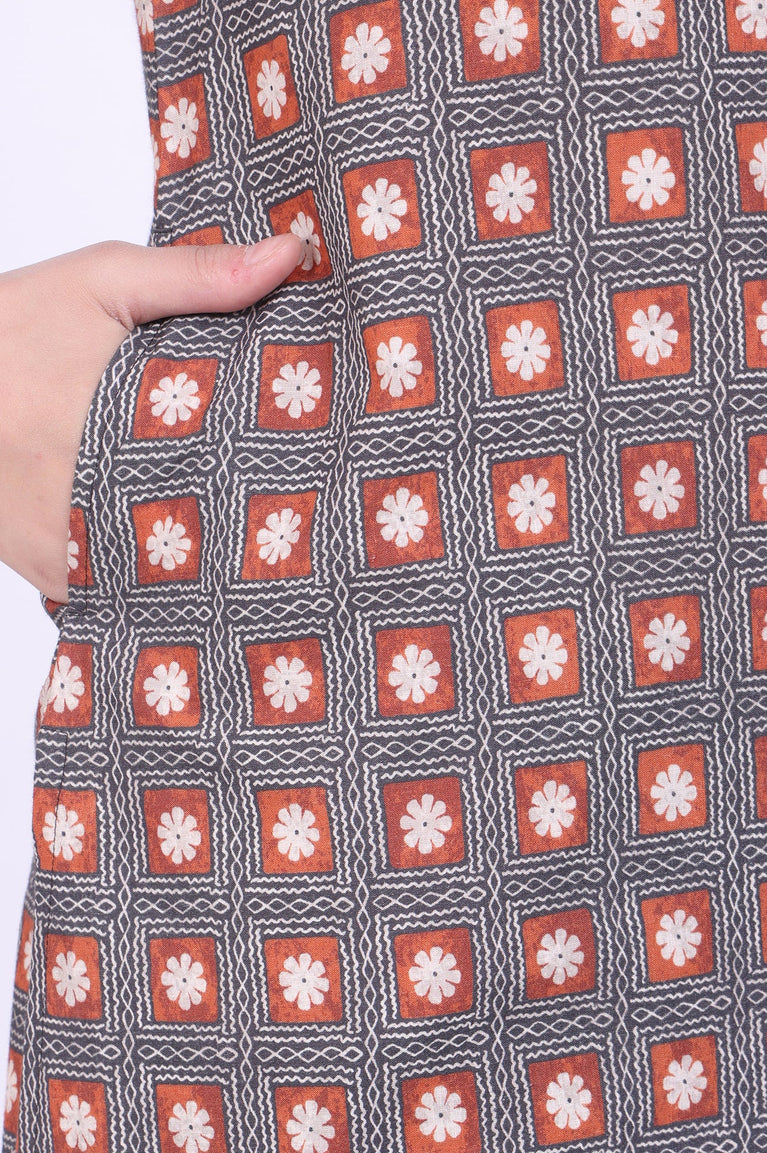 Our printed anarkali kurta is a statement piece. It features a round neck adorned with piping and contrasting buttons on the front panel, adding a trendy twist to the design. Additionally, a dori tie is provided for easy adjustment, ensuring a comfortable and flattering fit. This kurta is perfect for elevating your style with its combination of traditional and modern elements.