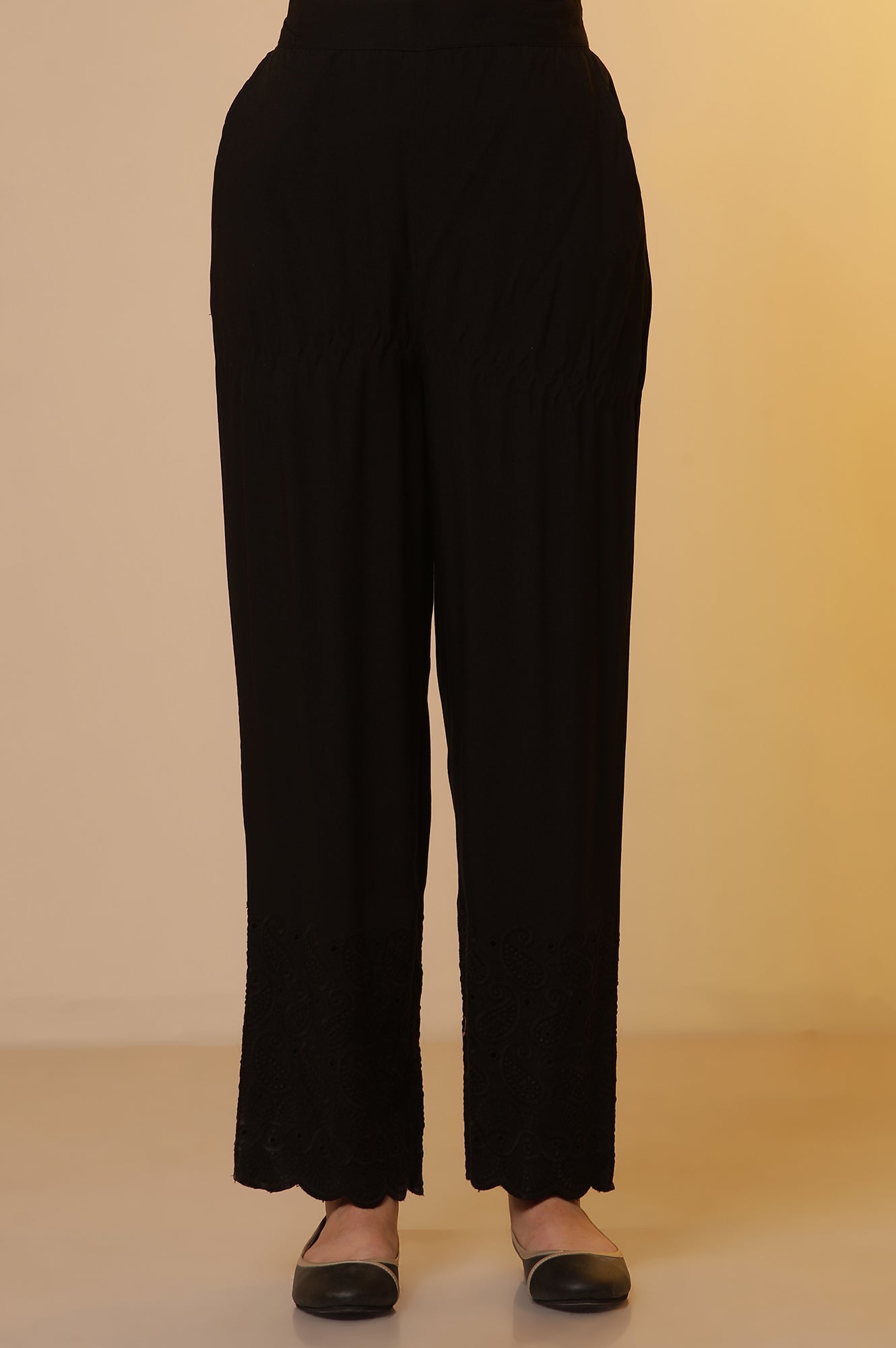 Experience the perfect blend of style and comfort with our schiffli embroidered narrow palazzo. The flat front design embodies timeless sophistication, while the back, elasticized for a perfect fit, side pockets adds practicality to your everyday life.