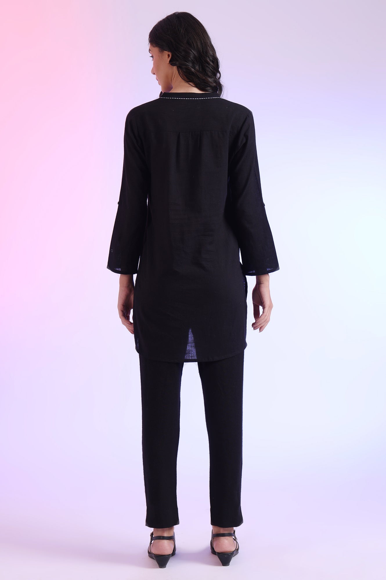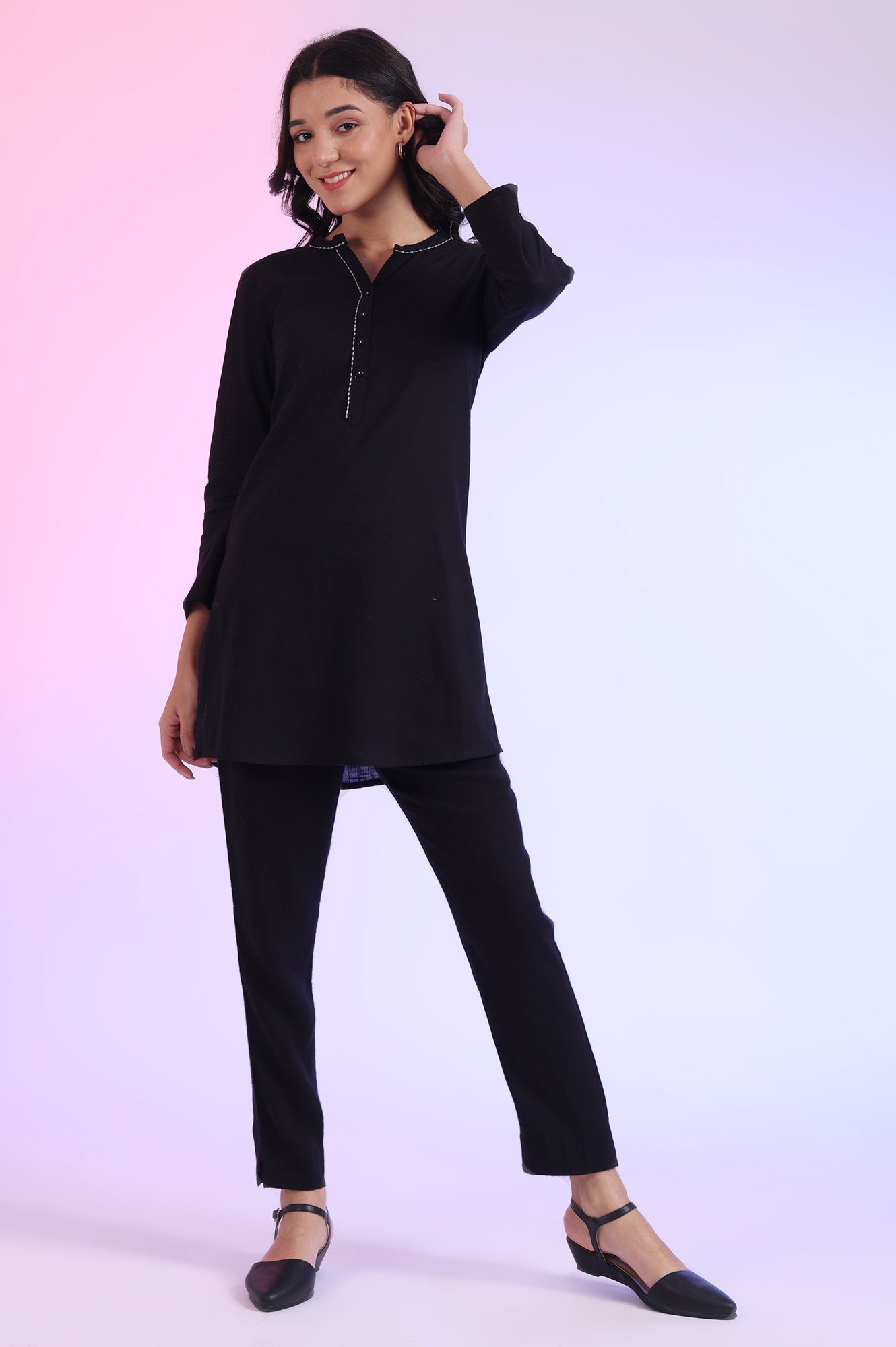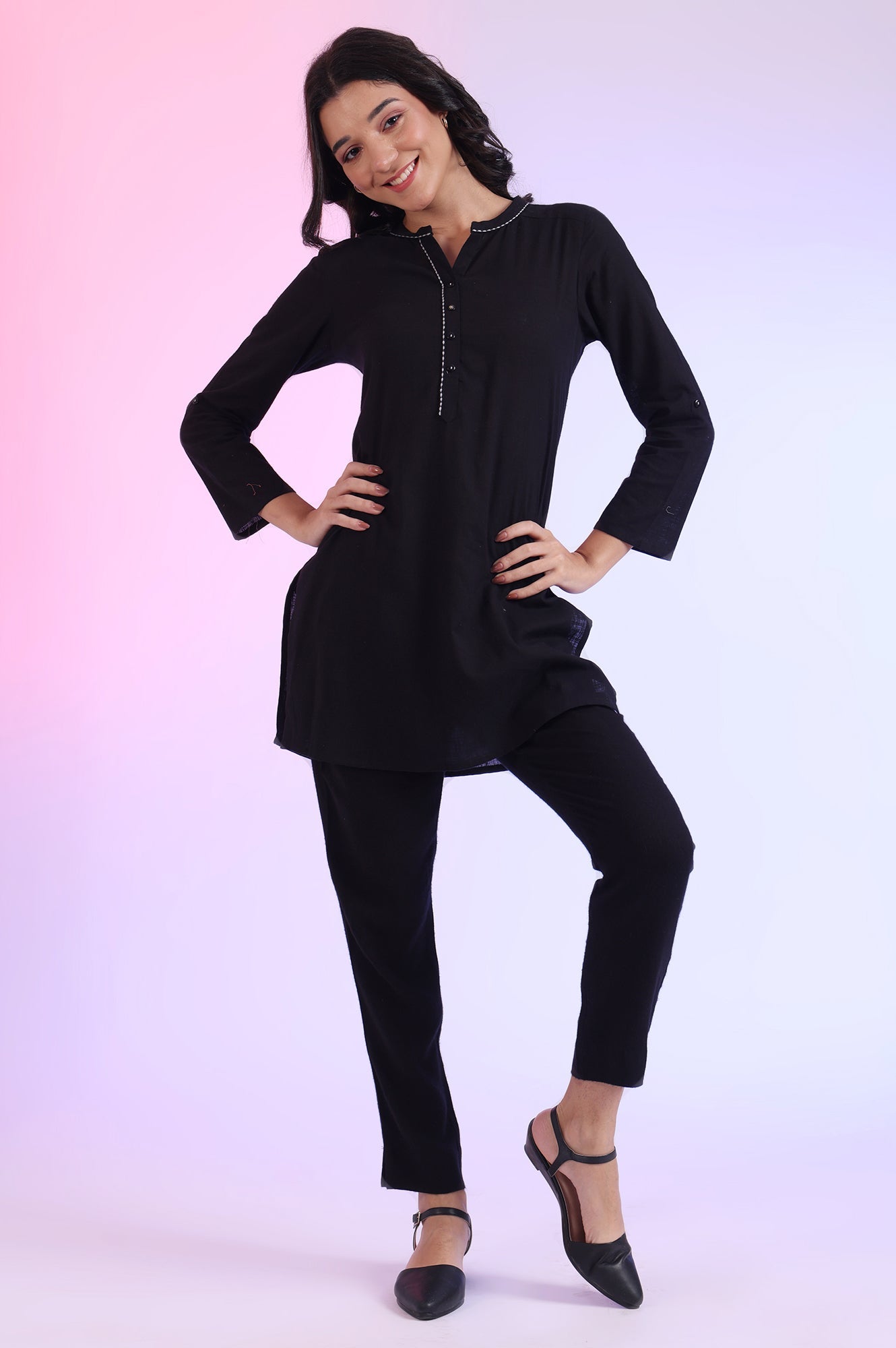 Experience the perfect blend of comfort and style with Aurelia's fusion kurti. This mid-thigh length kurti features a band neckline and three-quarter sleeves, making it ideal for casual wear. Crafted from pure cotton, it ensures breathability and softness against your skin. The black hue adds versatility to your wardrobe, while the straight cut and slit detail enhance its contemporary appeal. This woven kurti is designed for the modern woman who values both tradition and trend. The 100% cotton composition guarantees durability and easy maintenance. Whether you're running errands or meeting friends for a casual outing, this kurti will keep you looking effortlessly chic. Its fusion ethnicity allows for versatile styling options, making it a must-have addition to your wardrobe. Aurelia's attention to detail and quality craftsmanship shines through in this piece, offering you a perfect balance of comfort and fashion.