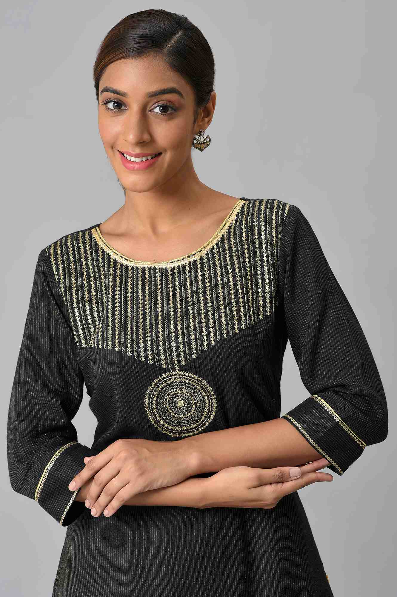 Black Zari Embroidered and Sequins Viscose Blend Straight Kurta and Palazzo Set