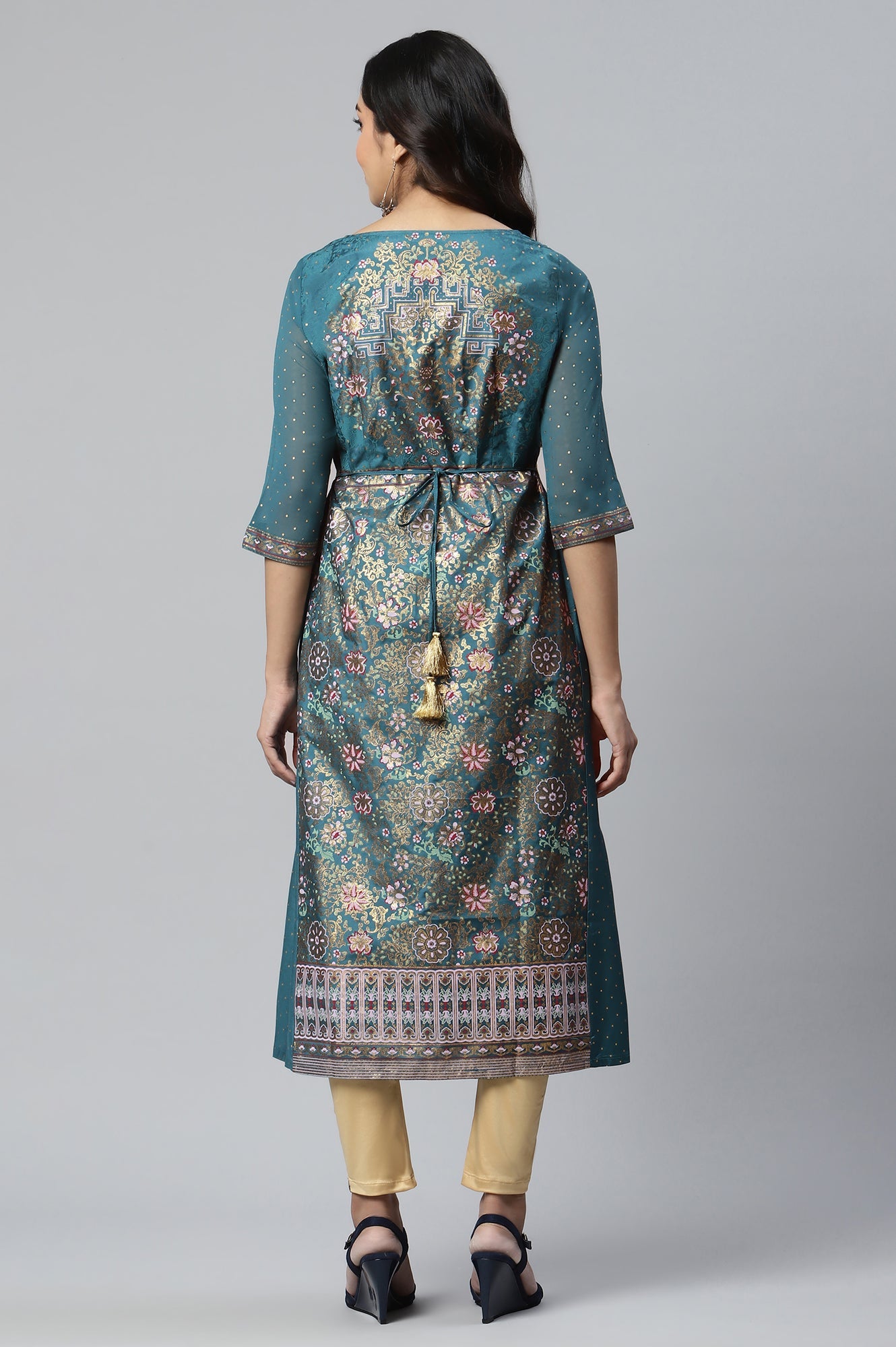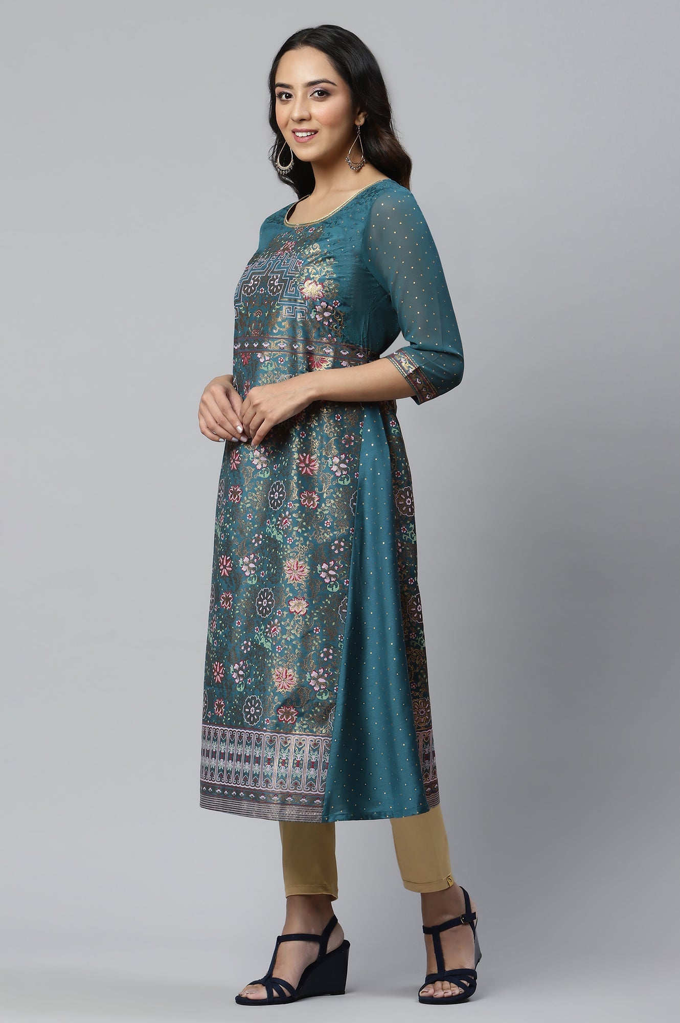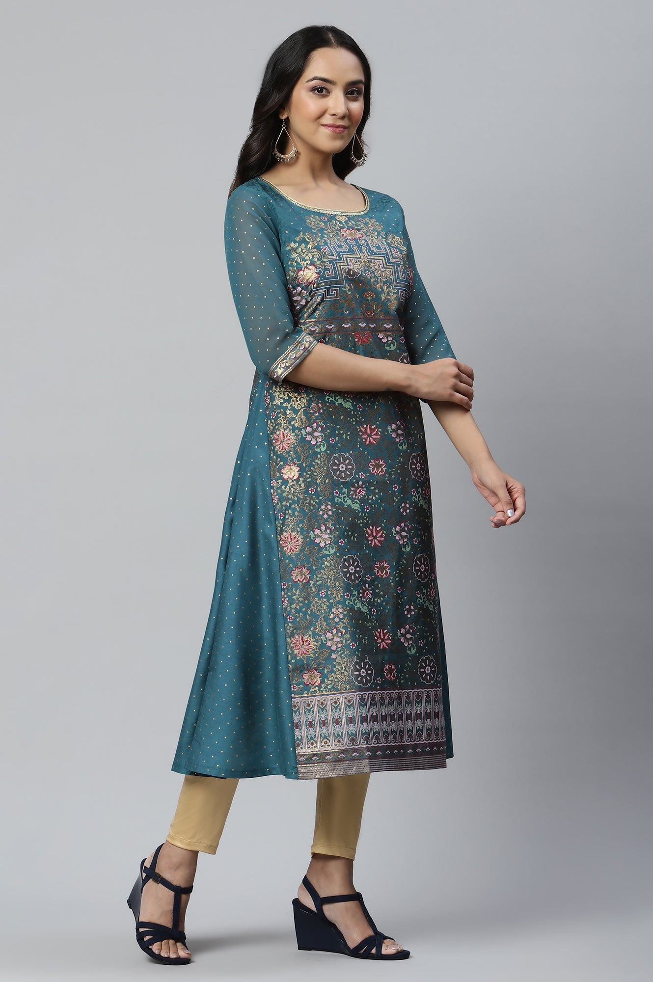 Teal A-line kurta with gusset detail, sheer georgette sleeves and a vibrant placement print. This style is perfect for a festive evening. It can be paired with our new exclusive golden chocker neck dupatta and our classic golden tights.