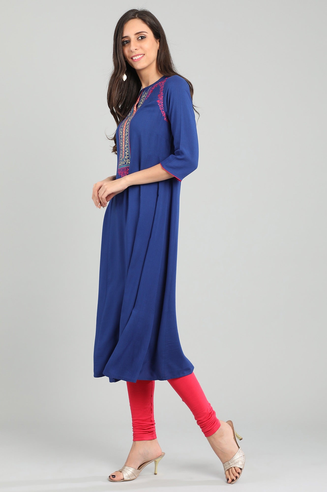 Blue band collar 3/4 sleeve kurta with placket detail.