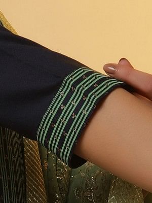 Get ready for the light festive look with this pretty foil printed kurta set. The kurta has embellished round neckline and printed border on sleeves' hem. It is paired with contrasting green printed palazzos and dupatta.