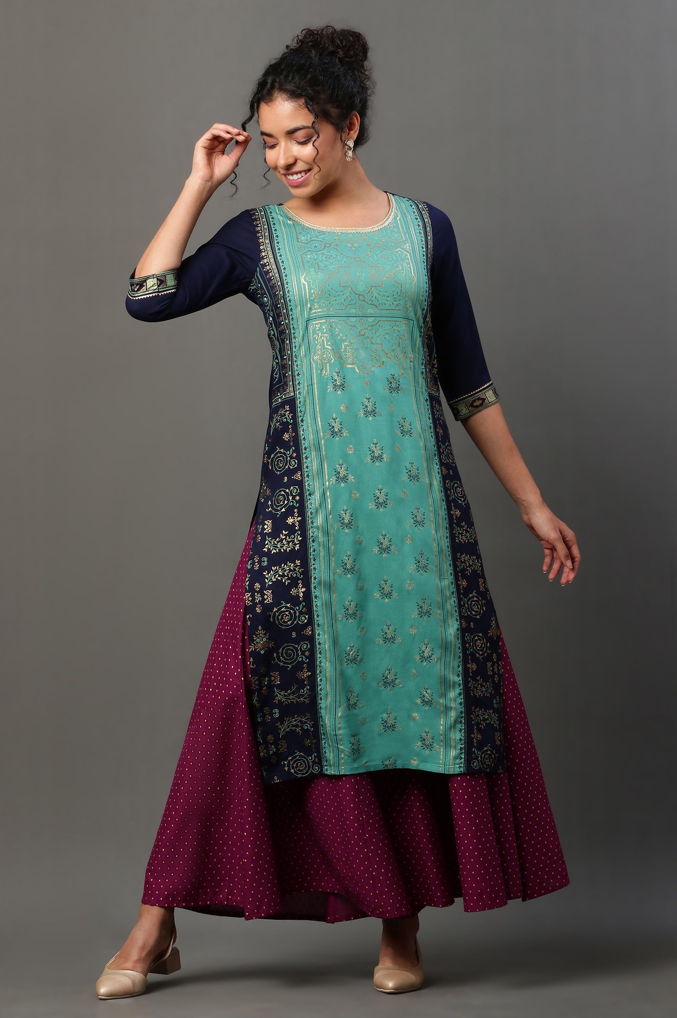 Our best seller silhouette of contrast front panel is a no brainer for this season, this piece has been curated keeping in mind all the festivity and celebration around. Printed with gold foil and heavy lace patch around neck makes this a perfect fit for your wardrobe.