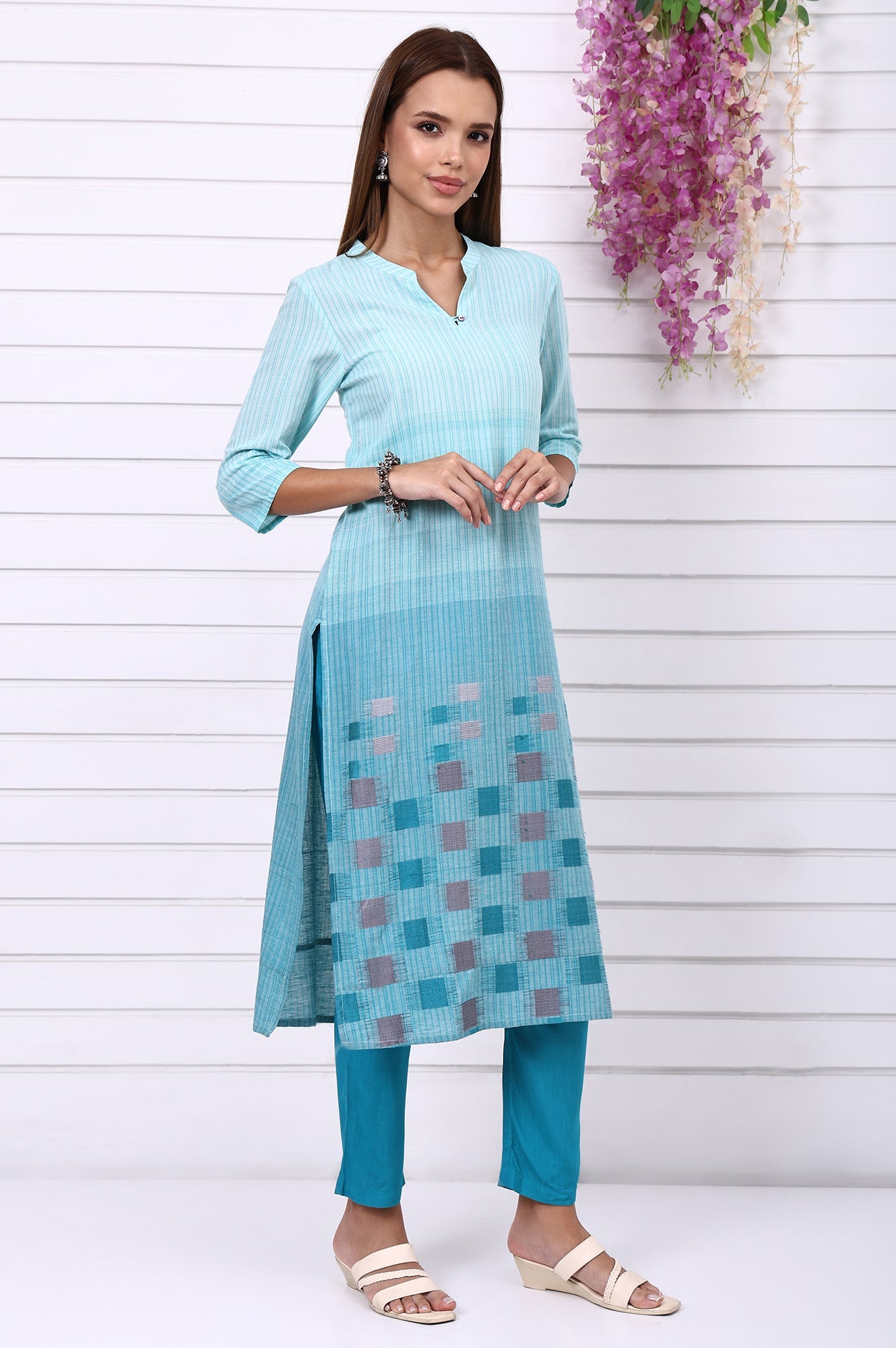 This blue co-ord set combines the graphic clarity of geometric prints with the tactile richness of yarn-dyed fabric. The straight kurta and trousers create a sleek profile that’s ideal for work or smart-casual occasions. The yarn-dyed base enhances the colorfastness and adds subtle texture, while the geometric motifs keep the look modern and urban.