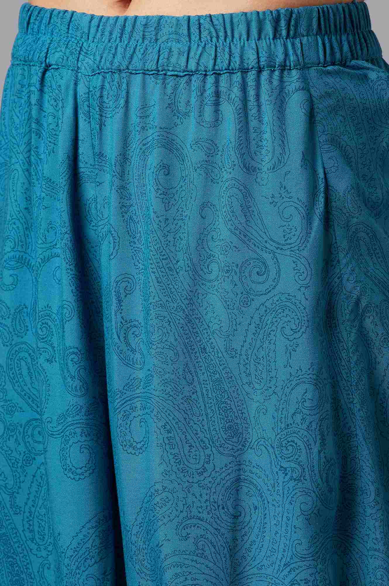 A straight printed kurta which is Tailored to give straight fit and has round neckline. It is paired with calf length culottes in mid-rise and elasticated waistband.