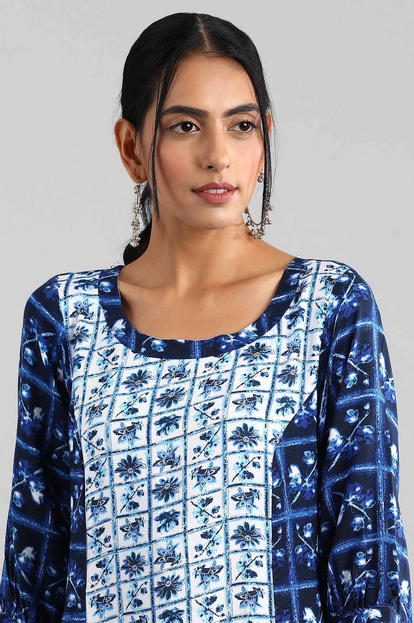 Blue round neck A-line kurta with asymmetrical hemline and printed detail.