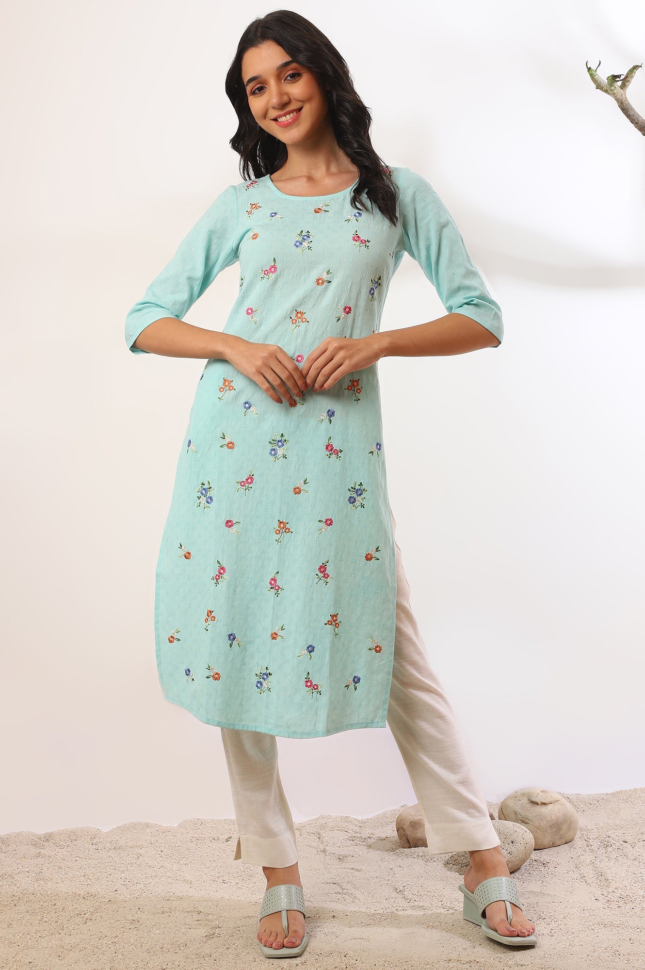 Discover the perfect blend of comfort and style with this women's Aurelia blue kurta. Crafted from pure cotton, this fusion-inspired piece is ideal for casual occasions. The three-quarter sleeves and round neckline offer a classic look, while the below-knee length and straight cut create an elegant silhouette. The woven construction technique ensures durability, and the zari detailing adds a touch of sophistication. The slit detail provides ease of movement, making it perfect for everyday wear. This kurta combines traditional elements with modern design, making it a versatile addition to your wardrobe. The 100% cotton composition guarantees breathability and comfort throughout the day.
