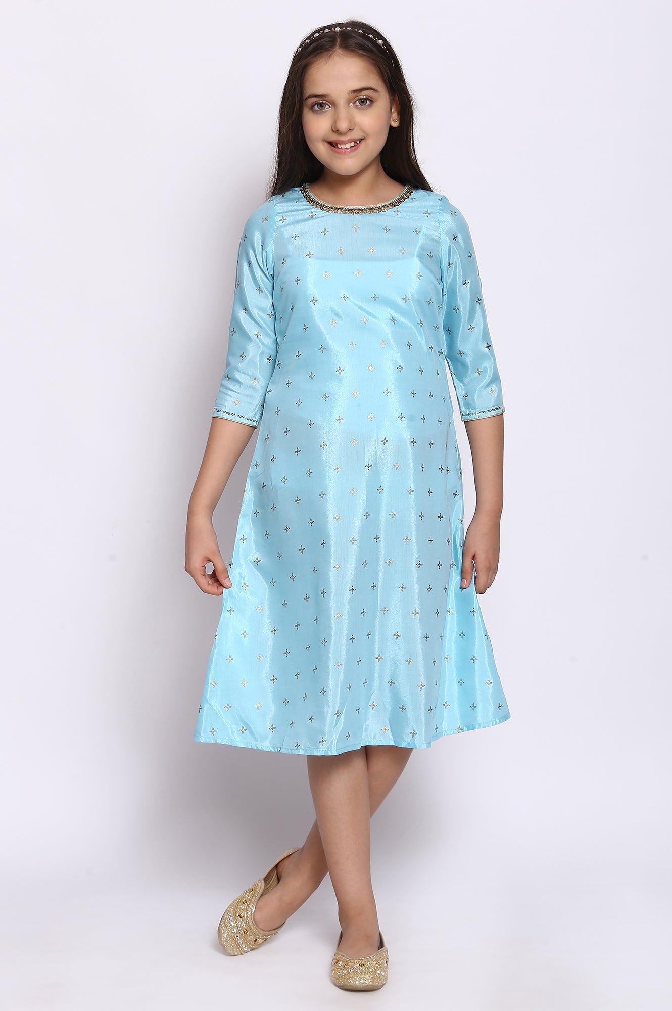 Blue Coloured Straight Sleeveless Dress That Features Floral Print, Sequin Embellished Round Neck And Back Button Closure. This Dress Set Contains A Contrasting All-Over Printed Gillet Having V-Neck, Three-Quarter Sleeves And Attached Dori With Tassels.
