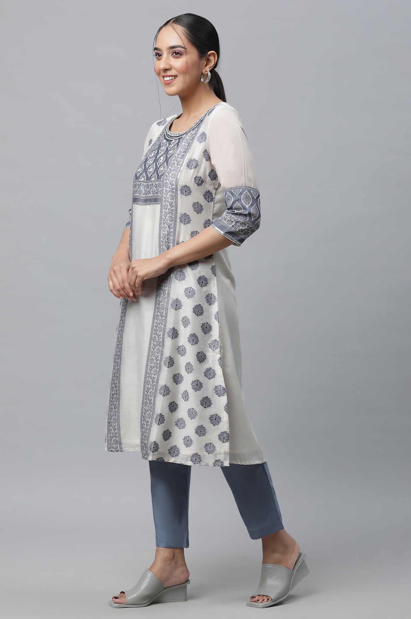Prep Yourself For A Gathering In This Elegant And Stylish 3 Piece Ethnic Set. The Set Includes Yarn-Dyed A-Line Kurta Embellished With Bead Work And Mid-Rise Ankle Length Trousers With Banaras Dupatta.