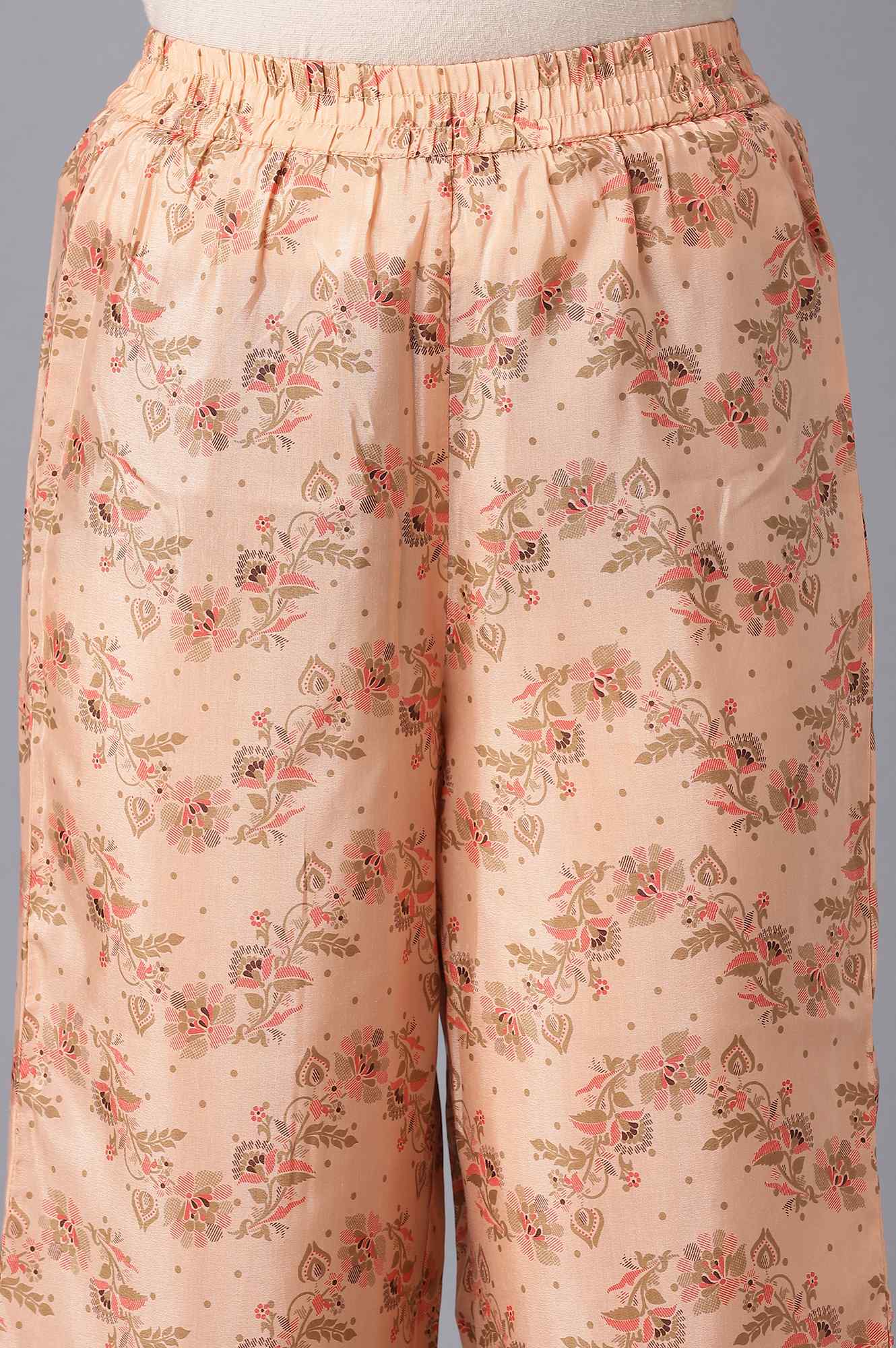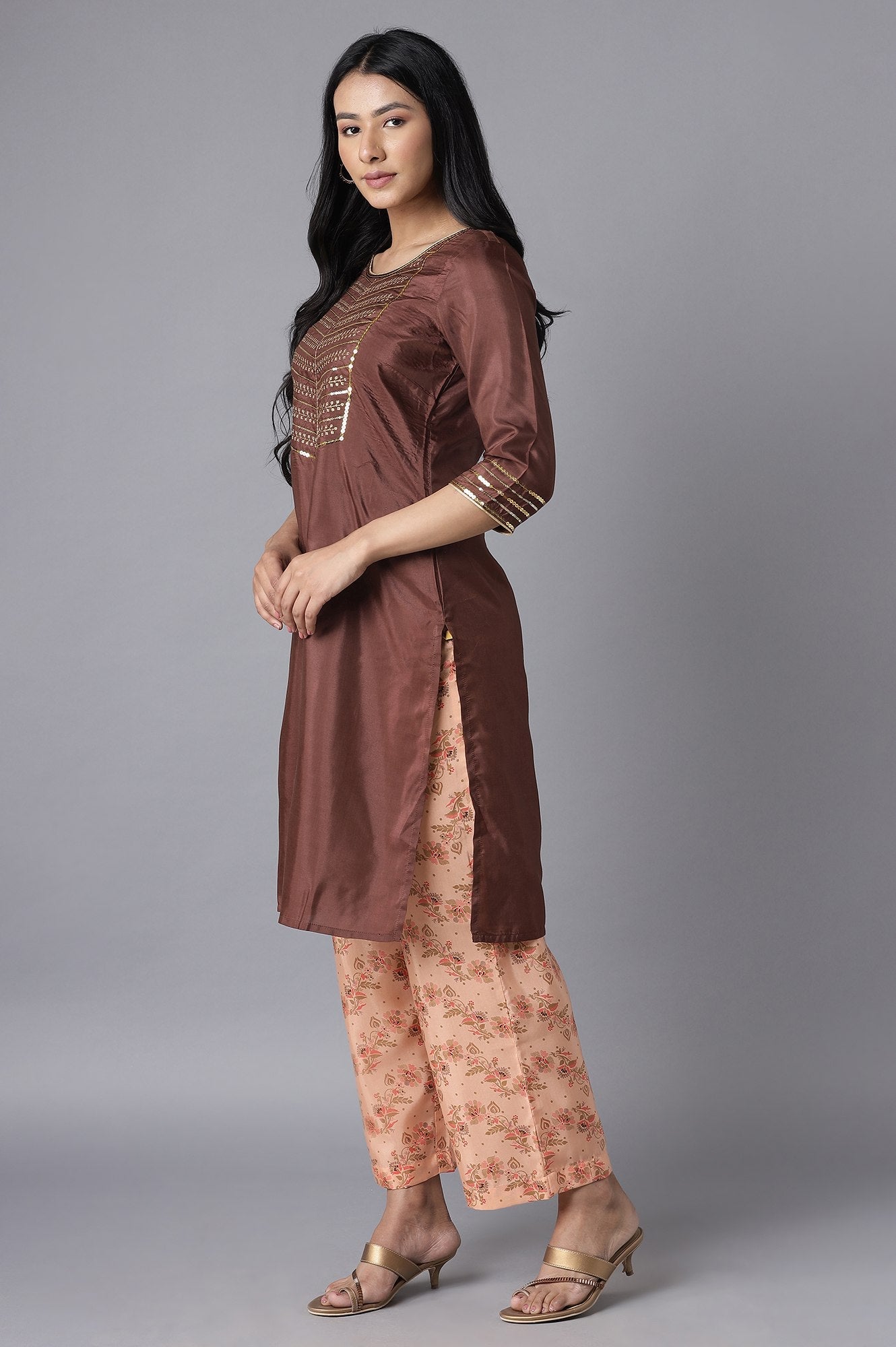 Make a sweeping entrance in this rich dark brown shantung kurta and culottes set to reinvigorate your wardrobe and mood. The kurta is adorned with zari embroidery and sequin work on yoke and sleeves hem. Coordinated with peach flared culottes in floral print and has mid-rise and partially elasticated waistband.