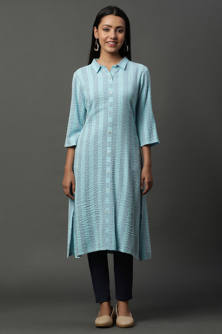Blue band collar straight Liva kurta yarn-dyed Liva kurta with placket detail, cuff sleeves and button.