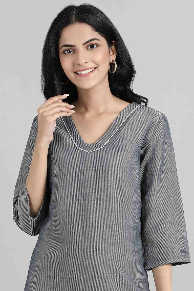 This blue V- neck 3/4 sleeve kurta has side slits.