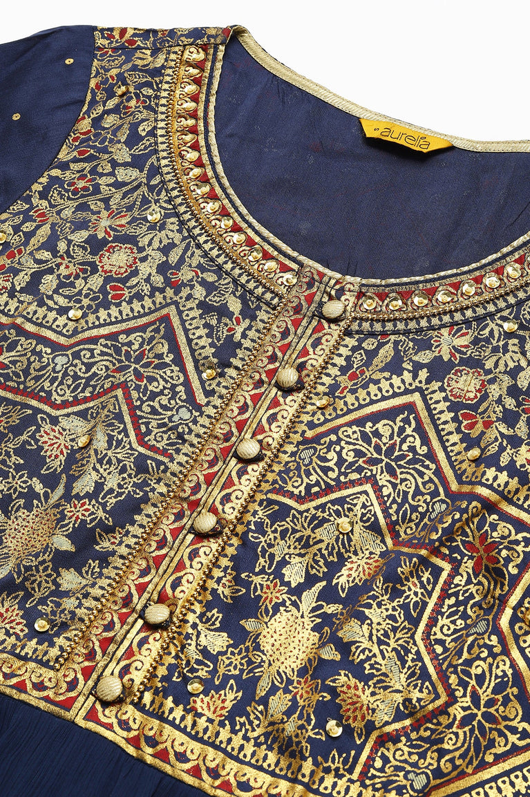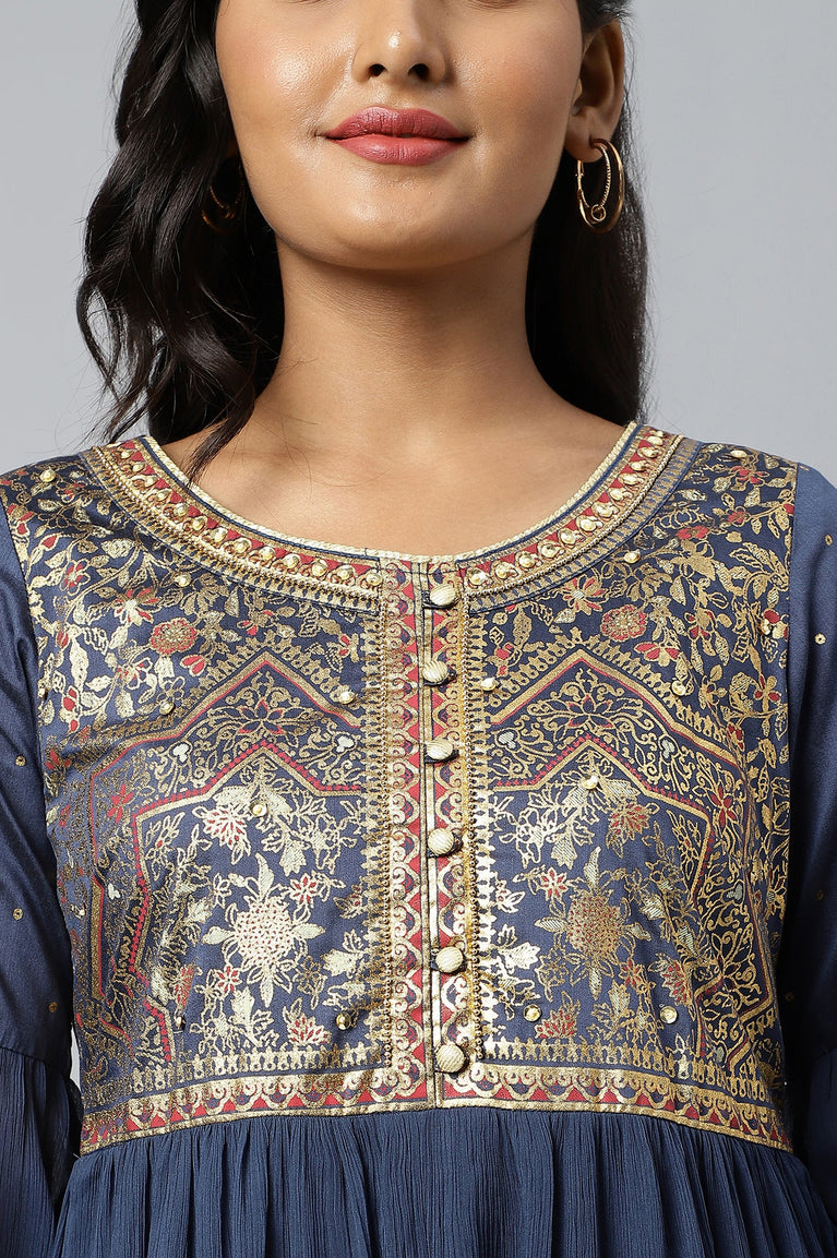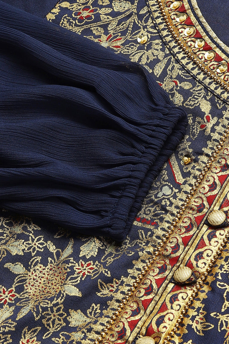 Midnight Blue chiffon LIVA dress with an ornate gold foil printed yoke is sure to make you feel an indian princess fantasy. This dress has a stylised sleeve detail. You can wear it as it is or pair it with our classic gold woven dupatta.