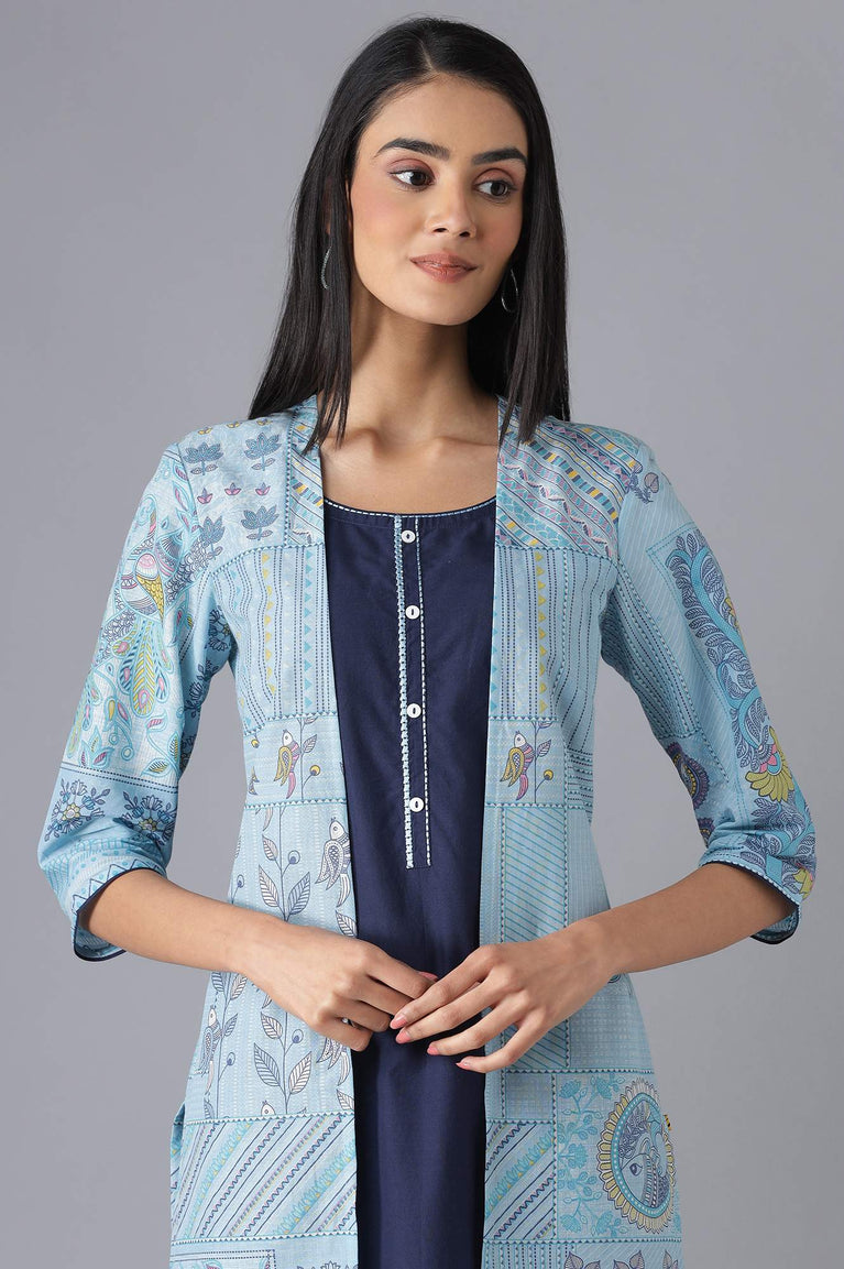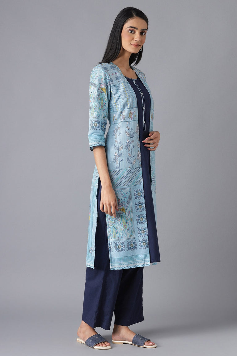 A perfect pick for your casual and workwear wardrobe. This blue straight silhouette printed kurta has round neck and three-quarter sleeves.