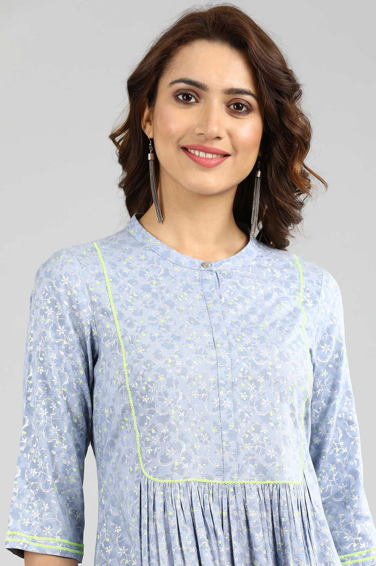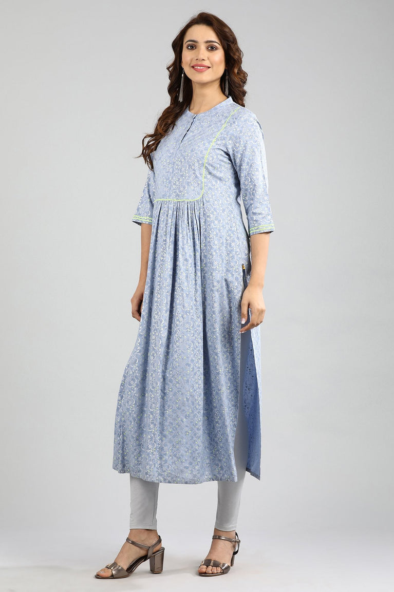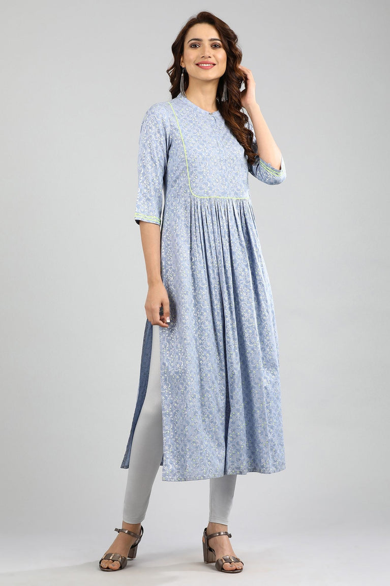 Blue straight round neck kurta with gathers on the front and printed detail.