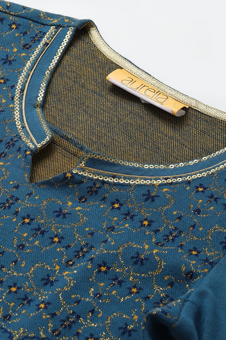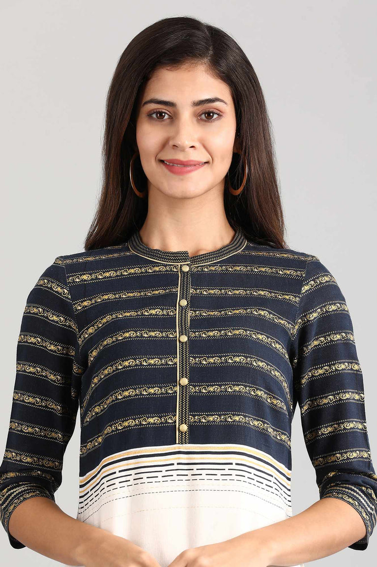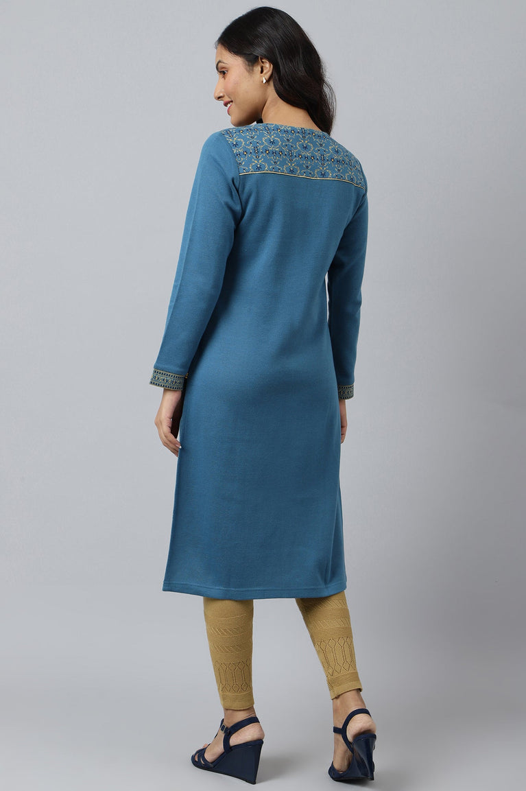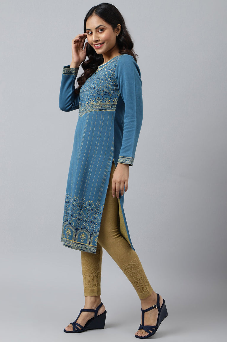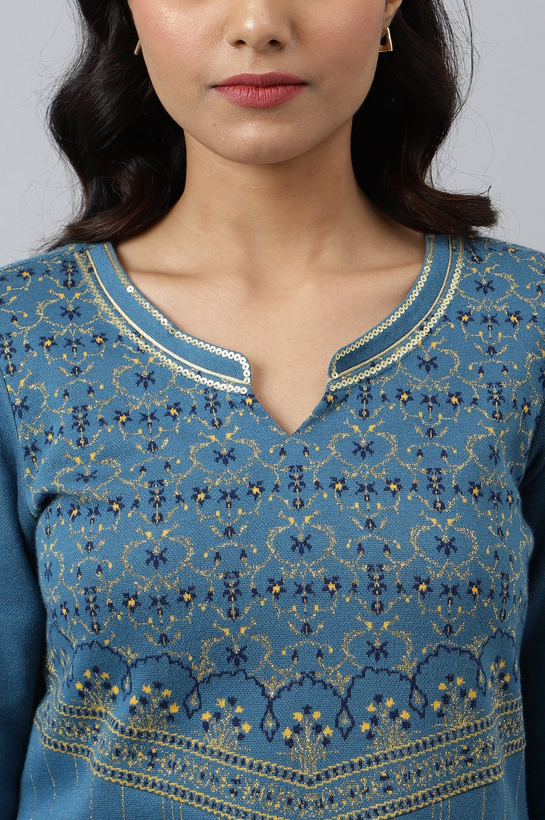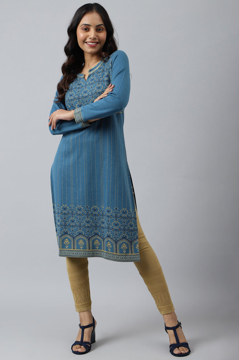This blue mandarin neck 3/4 sleeve kurta has printed yoke and concealed placket on the front.