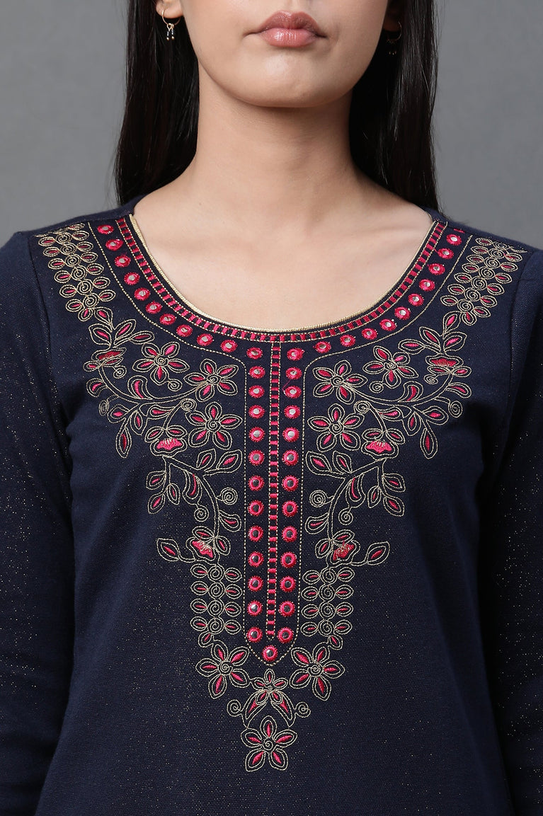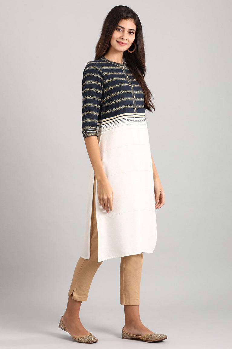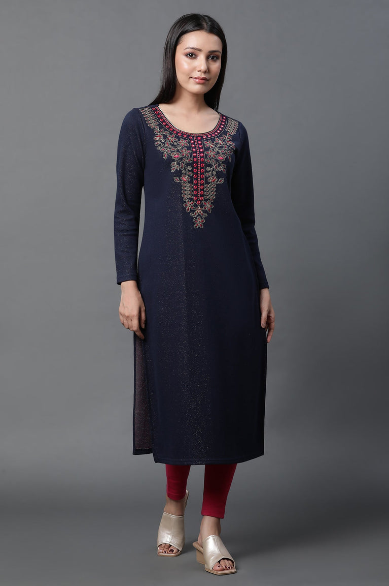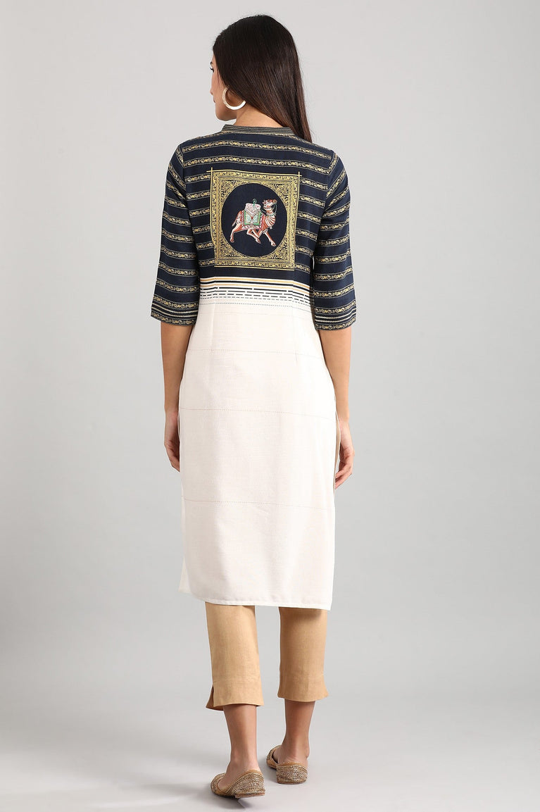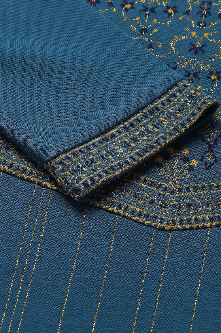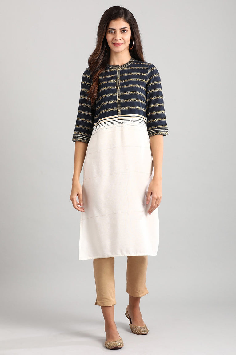 This blue mandarin neck 3/4 sleeve kurta has printed yoke and concealed placket on the front.