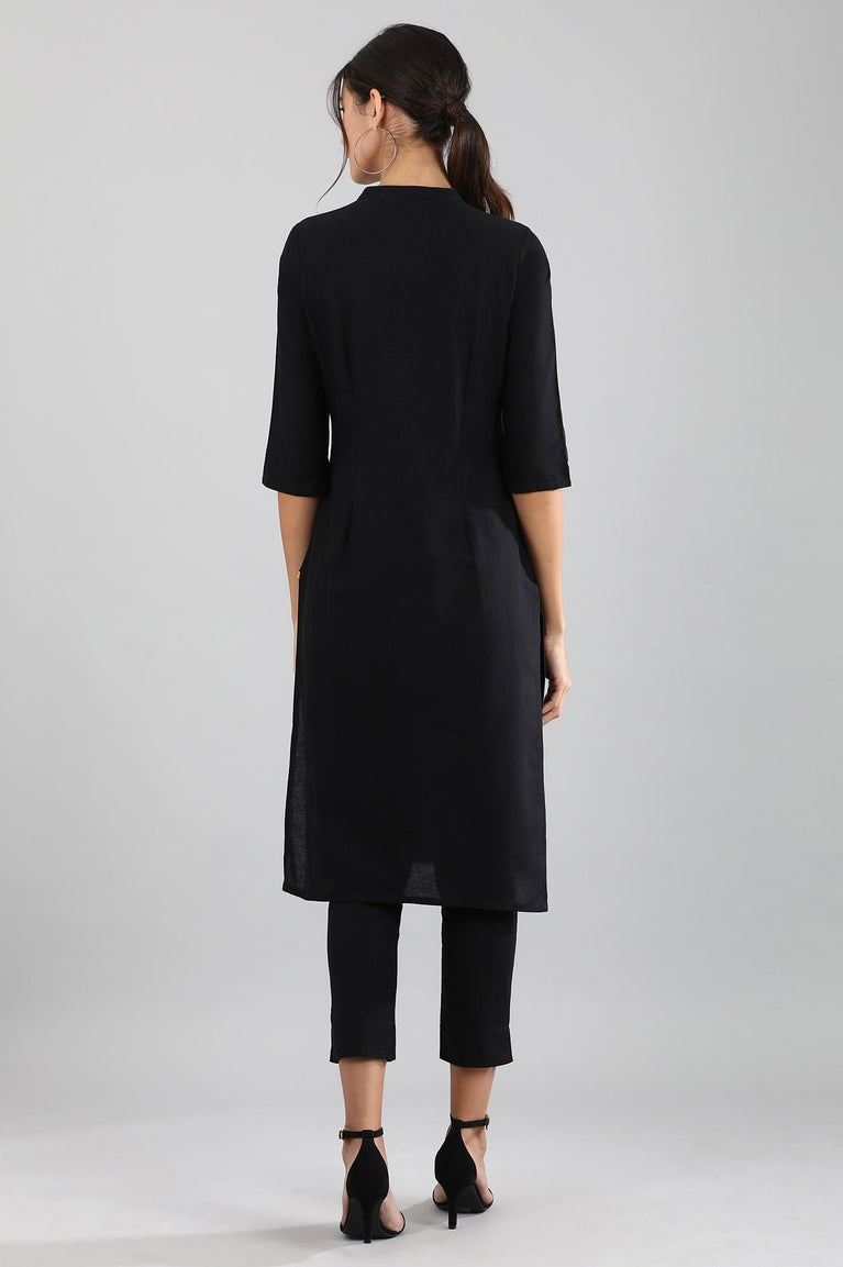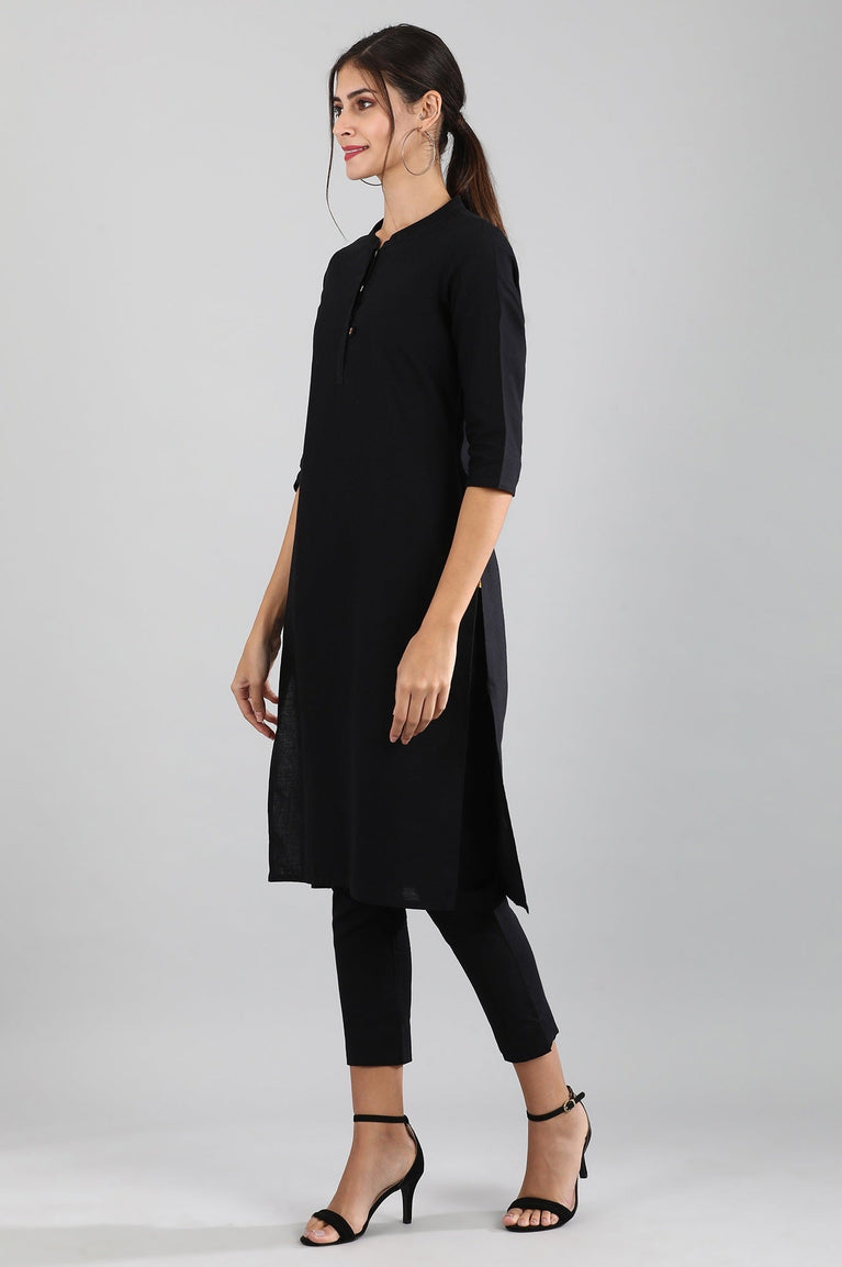 A perfect pick for your casual and workwear wardrobe. This black textured straight silhouette kurta has square neck and three-quarter sleeves.