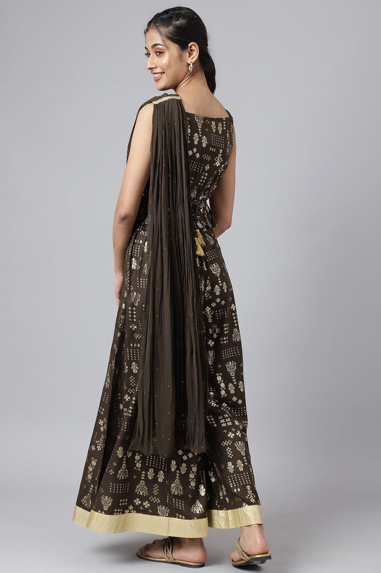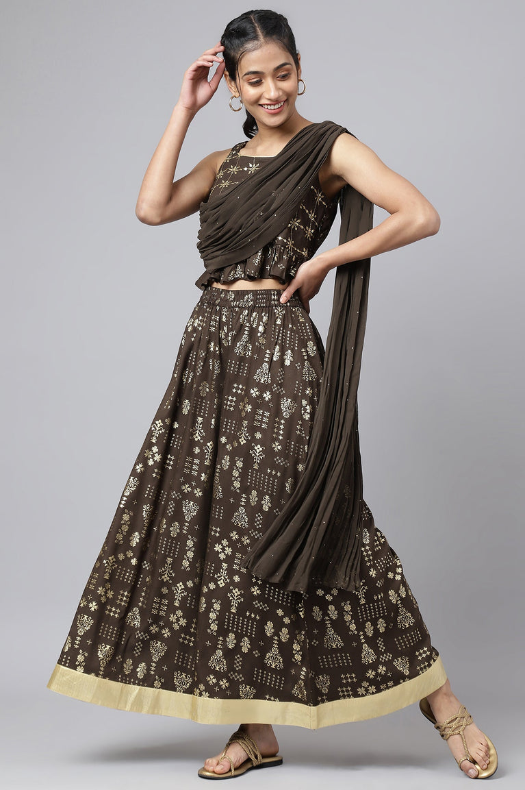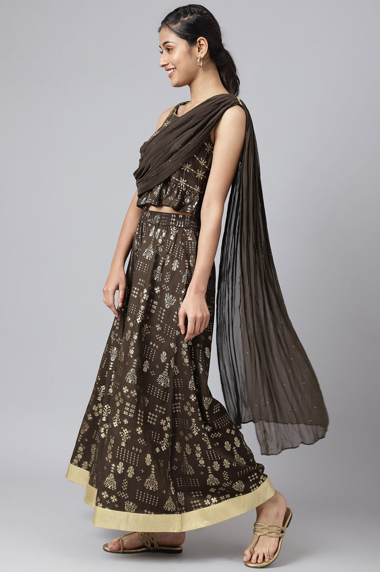 Brown Crop Top with Attached Dupatta and Semi Flared Palazzo Set
