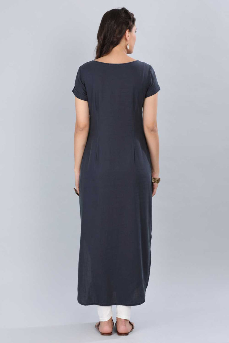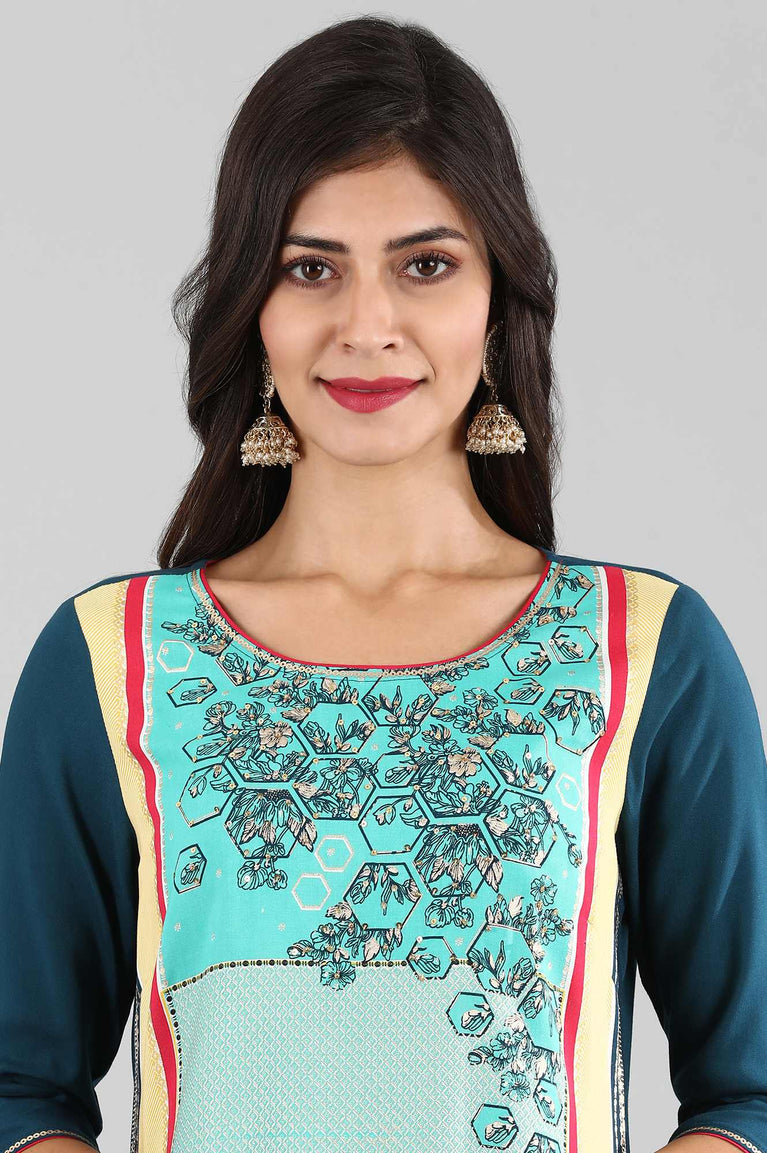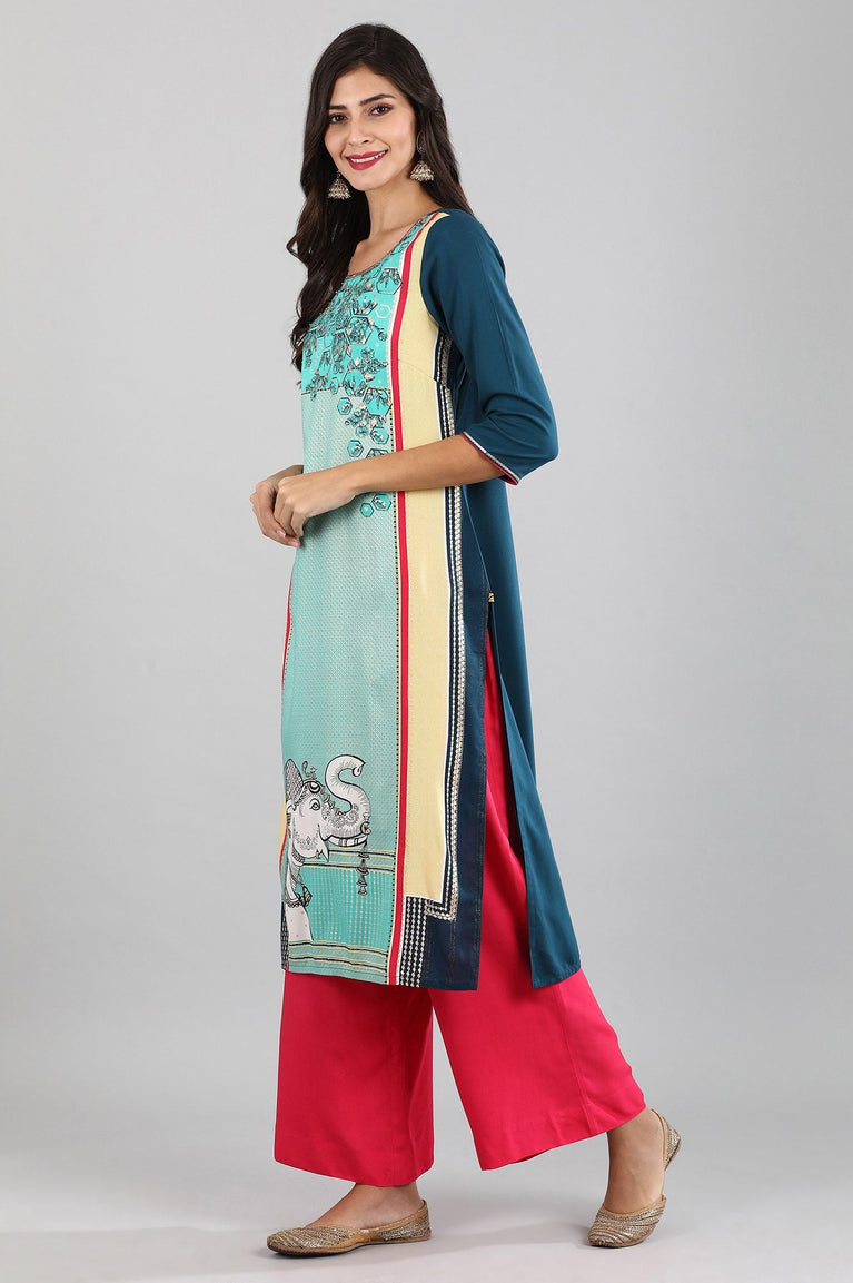 This blue round neck 3/4 sleeve kurta has printed detail and side slits.