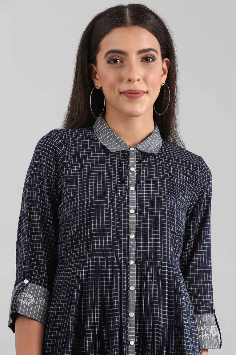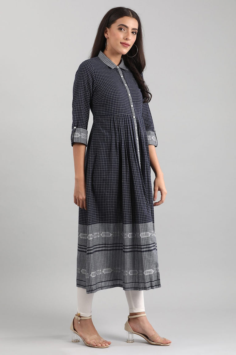 Blue shirt collar A-line kurta with gathers, placket detail and checkered pattern. This is exclusively from Disha's must-have closet.