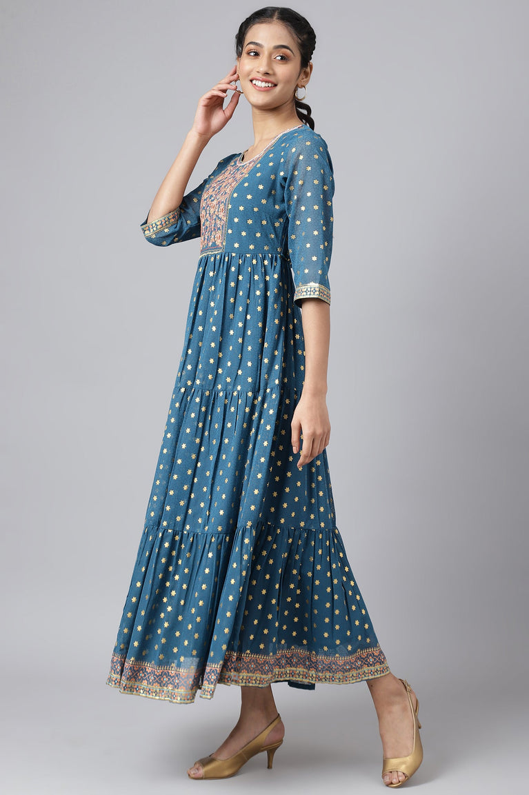 Sophisticated and Stylish, this corsair colour full length tiered dress has beautiful sequin embroidery at the yoke with mosaic pattern in gold foil print. This is a look that's sure to earn you compliments.