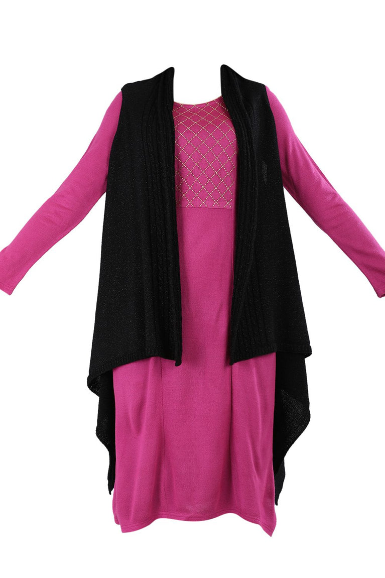 Black shawl collar sleeveless sweater with asymmetrical hemline.