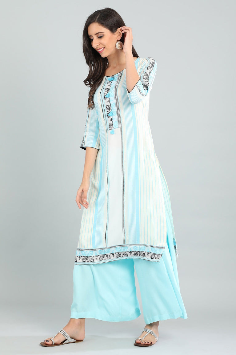 Blue round neck yarn-dyed kurta with mock placket on the front.