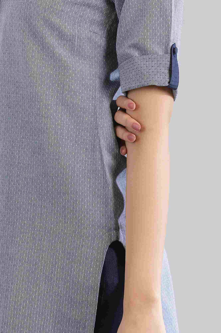 This blue mandarin neck 3/4 sleeve kurta has roll-up tab detail on the sleeve with button and keyhole detail and side slits.