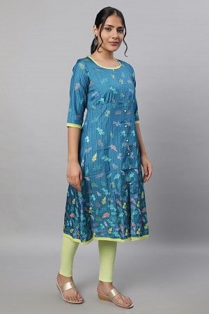 Blue Floral Printed Sequined Ethnic LIVA kurta