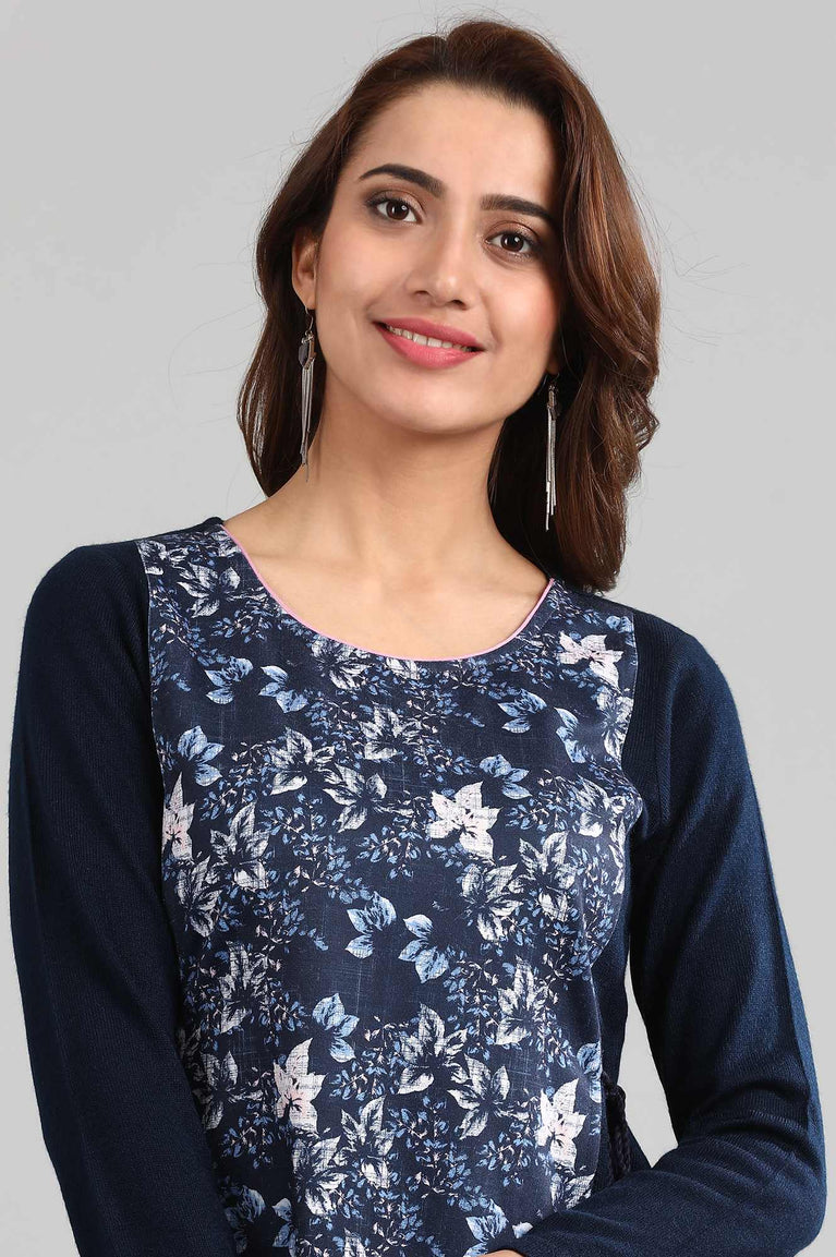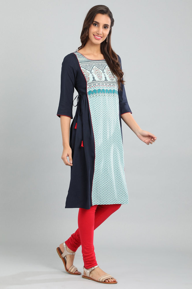Blue round neck 3/4 sleeve kurta with printed detail and tie-up at both sides.