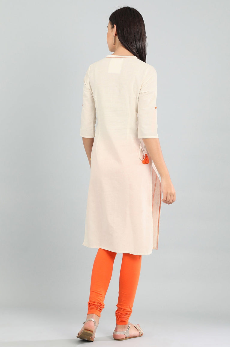 Ecru band collar 3/4 sleeve kurta with contrast printed detail, tie-up at one side and v-slit neckline. It is made up of cotton flax.