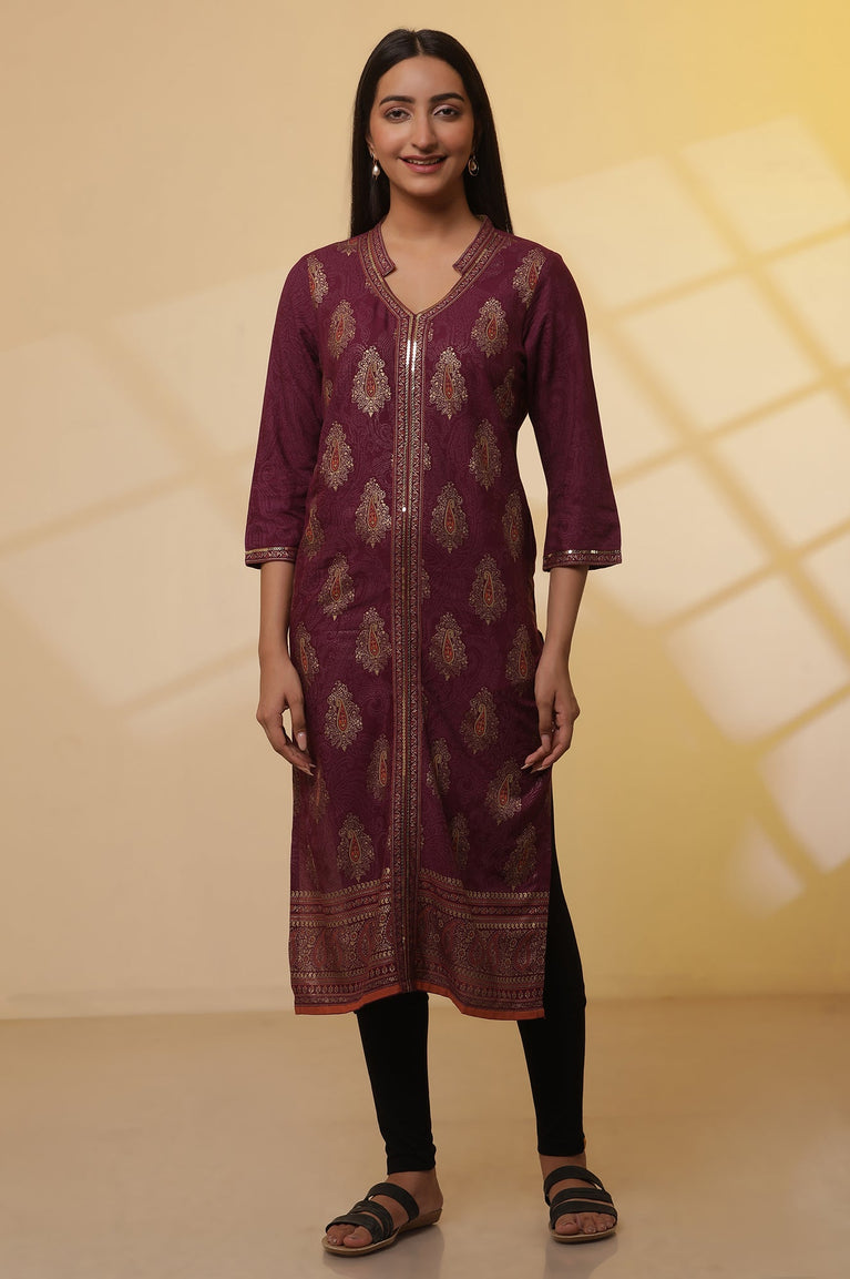 A perfect pick for your casual and workwear wardrobe. This black textured straight silhouette kurta has square neck and three-quarter sleeves.