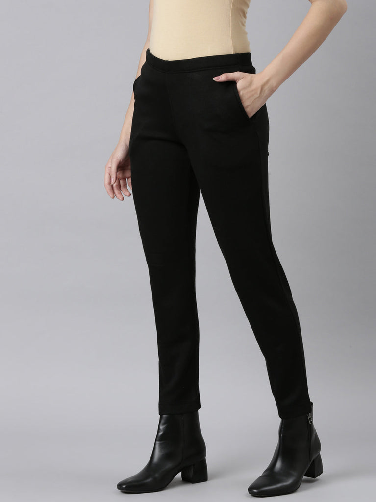 Wear a crisp white button down or a tee our Solid Black Ponte Pants are the perfect pair to team it up with. Made from stretch viscose, nylon & elastane fabric, it has elasticised waistband, slant pockest & slim fit.