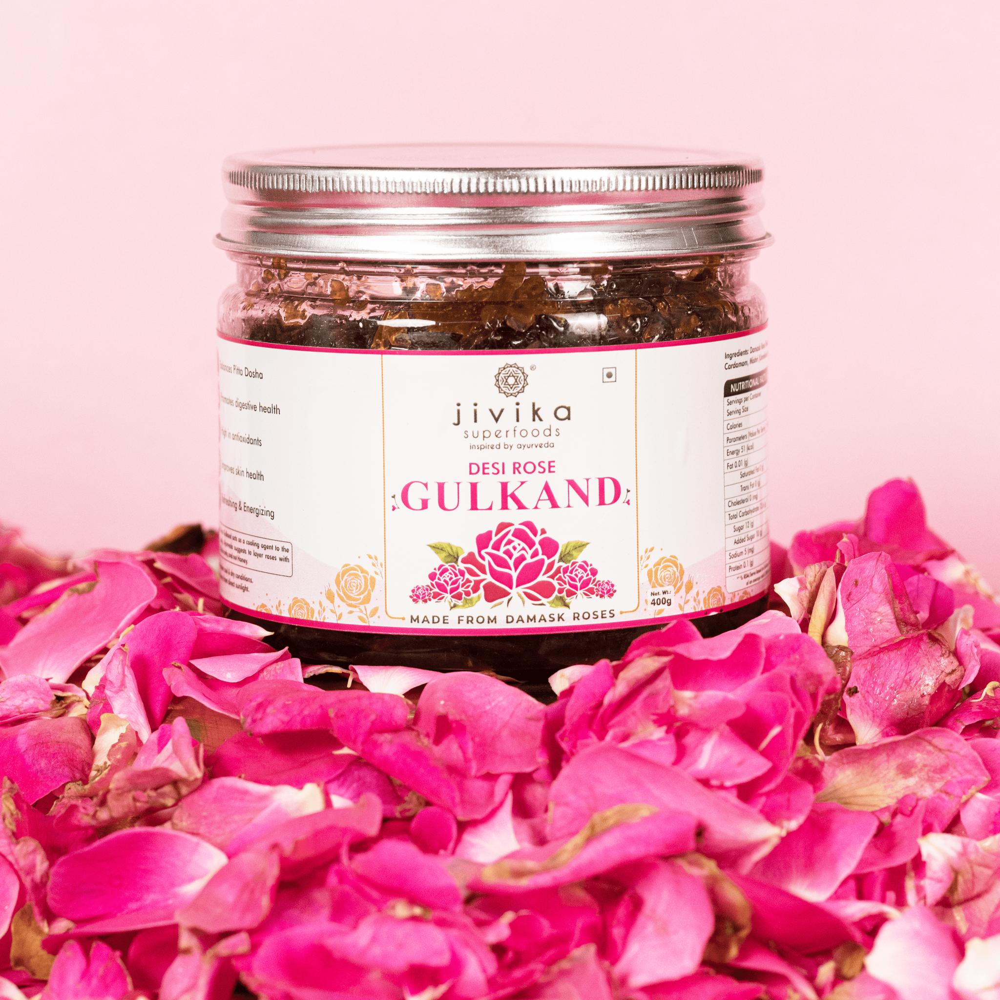 Made from fresh and nutritious Damask Roses, Jivika Organics Desi Rose Gulkand can enrich any diet l. The word Gulkand™ translates directly into Sweet-Rose™. The practice of preserving vibrant rose petals is a long standing tradition in Ayurvedic medicine.