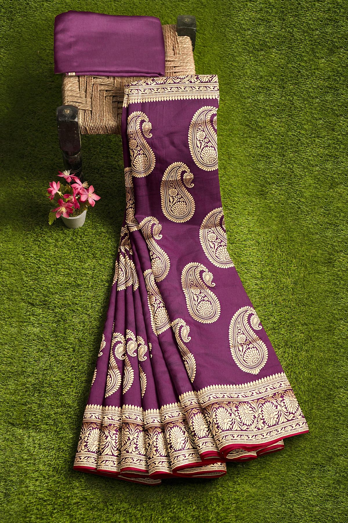 Latest MAGENTA BUTTIS SILK BLEND Saree with SELF ZARI border. This saree comes with PLAIN WITH BORDER SILK BLEND blouse.
