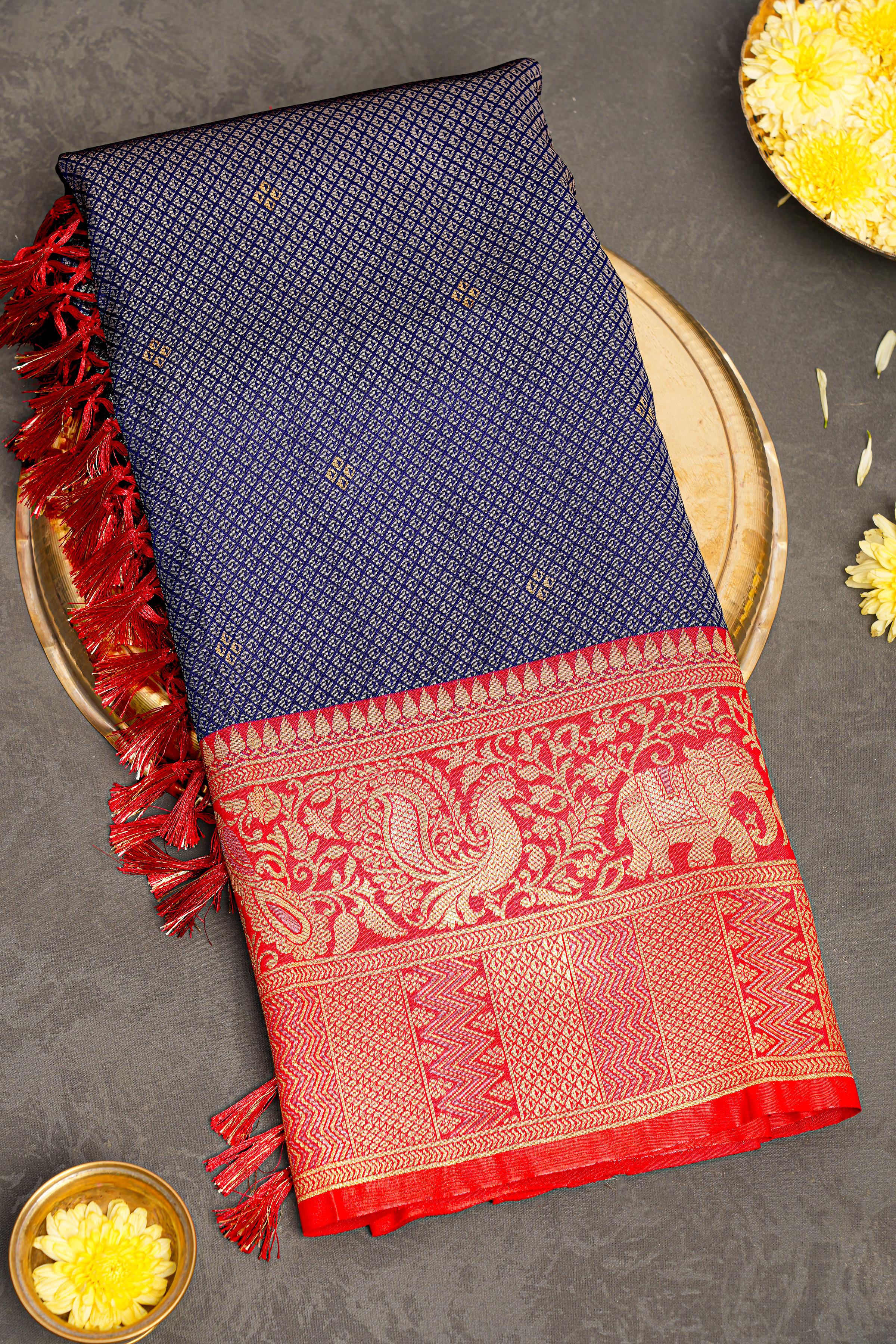 Latest NAVY BLUE BROCADE SILK Saree with CONTRAST ZARI border. This saree comes with CONTRAST WITH BORDER SILK blouse.