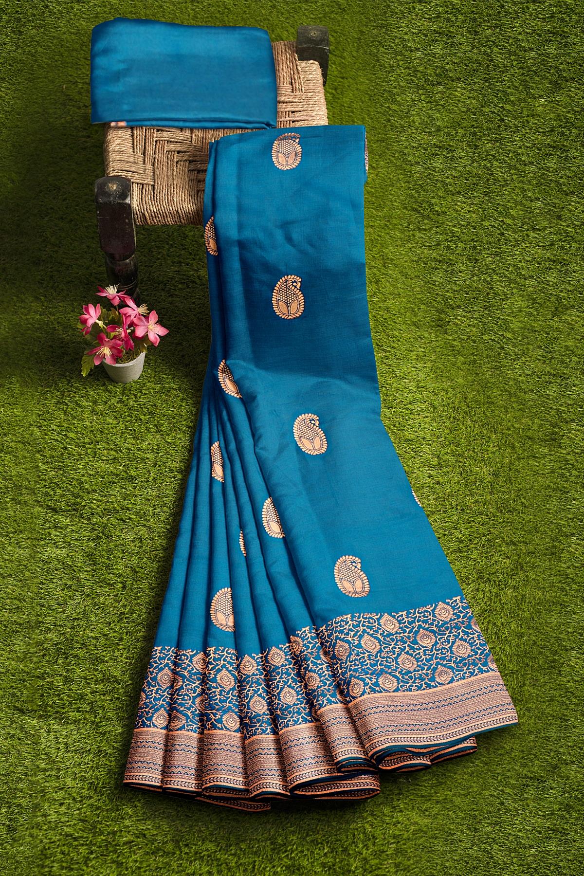 Latest ROYAL BLUE BUTTIS SILK BLEND Saree with SELF ZARI border. This saree comes with PLAIN WITH BORDER SILK BLEND blouse.